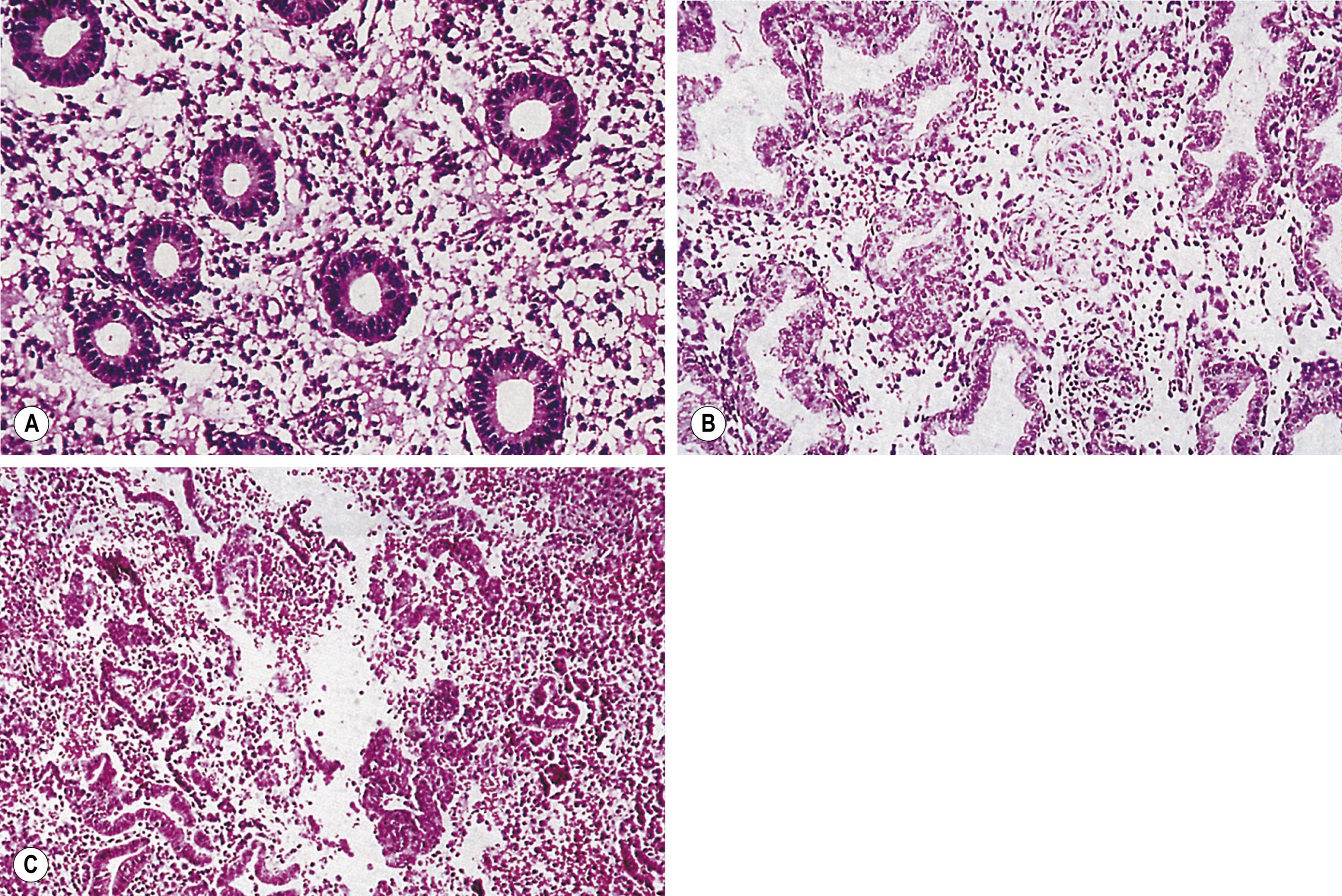 Hình 2.6 Những thay đổi có chu kỳ trong chu kỳ kinh nguyệt bình thường. (A) Giai đoạn tăng sinh. (B) Giai đoạn giữa hoàng thể. (C) Giai đoạn hành kinh.