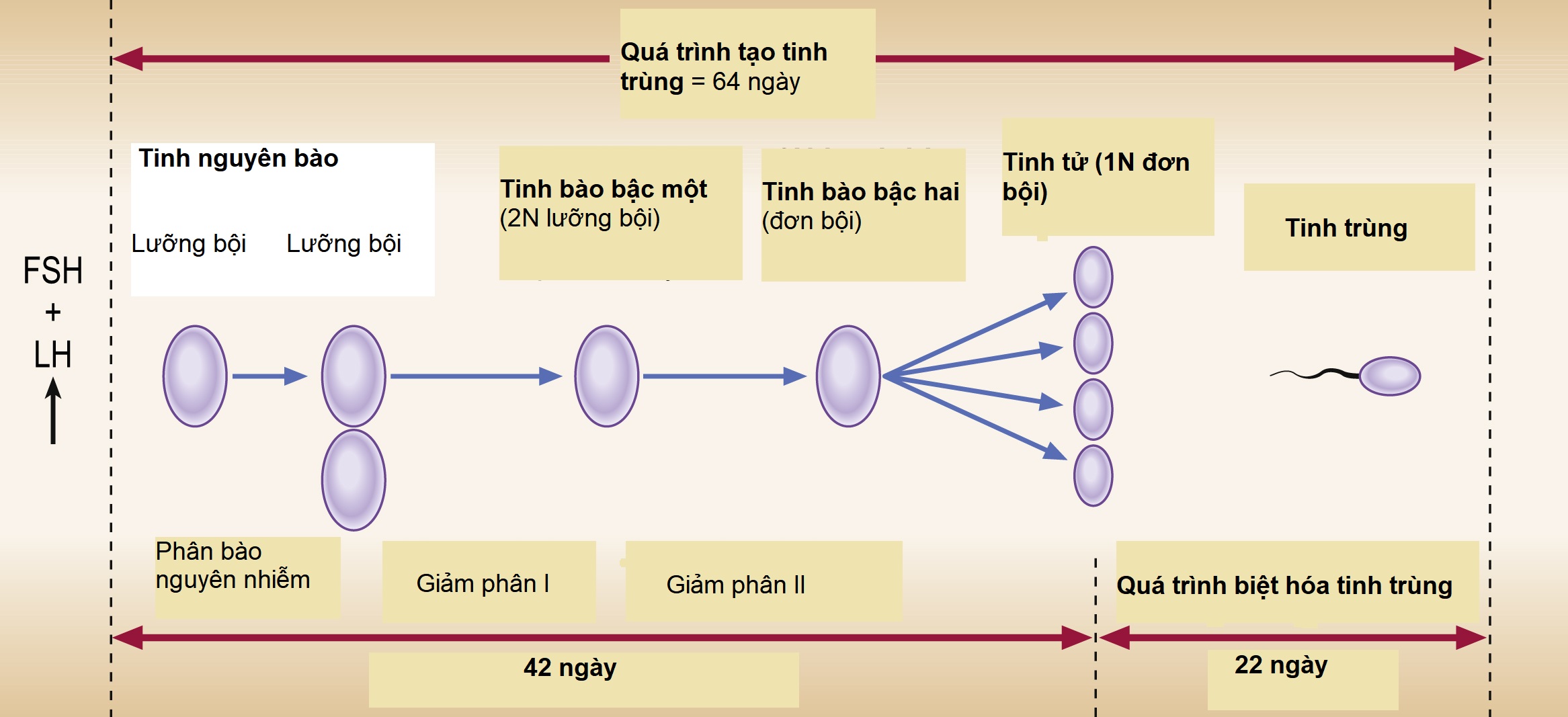 Quá trình trưởng thành hoàn toàn của tinh trùng mất khoảng 64-70 ngày (Hình 2.7).