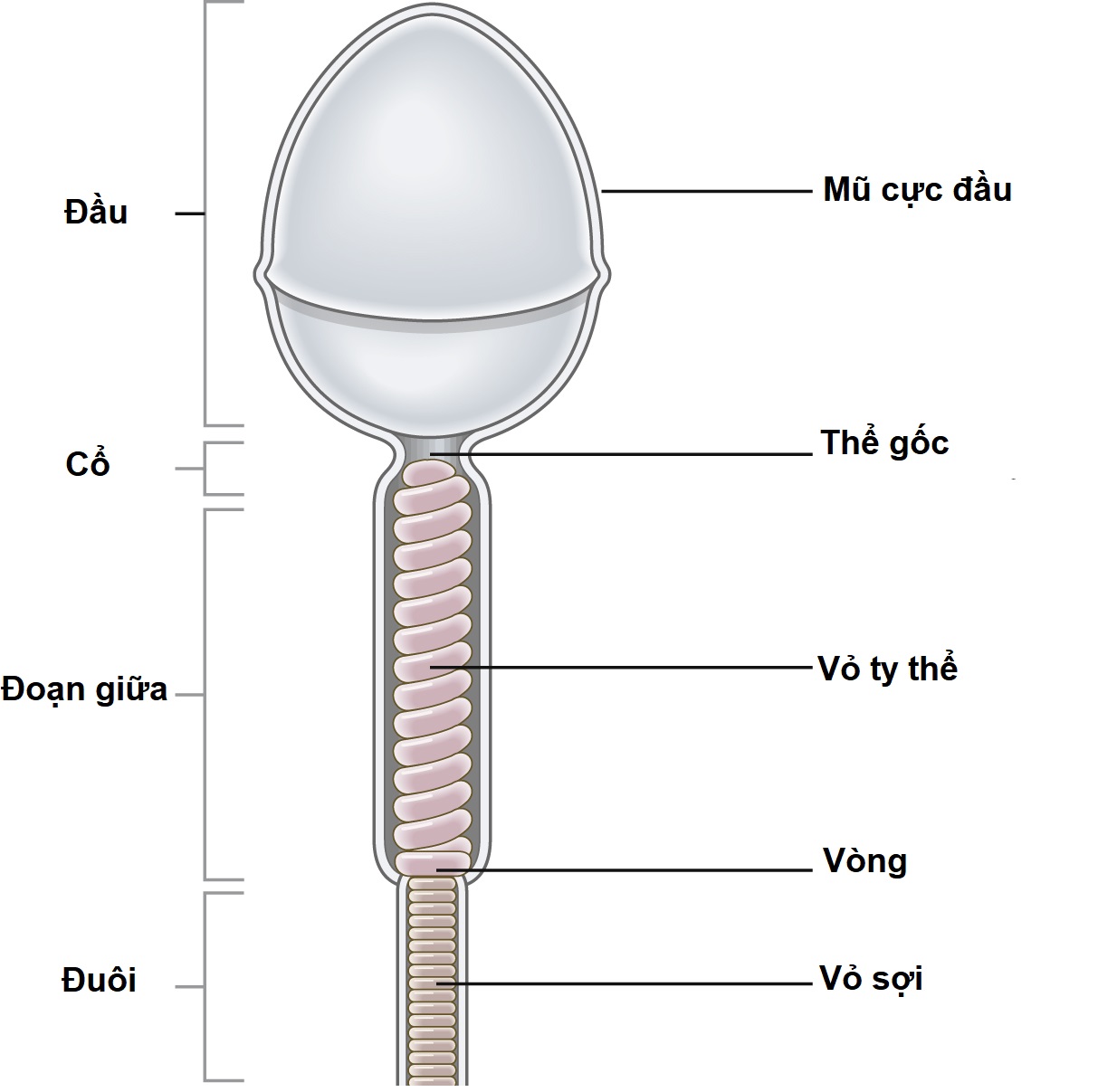 Tinh trùng bao gồm một đầu, một đoạn giữa và một đuôi (Hình 2.8). Đầu dẹt và có hình bầu dục và được bao phủ bởi mũ cực đầu (acrosomal cap), chứa một số lysin.