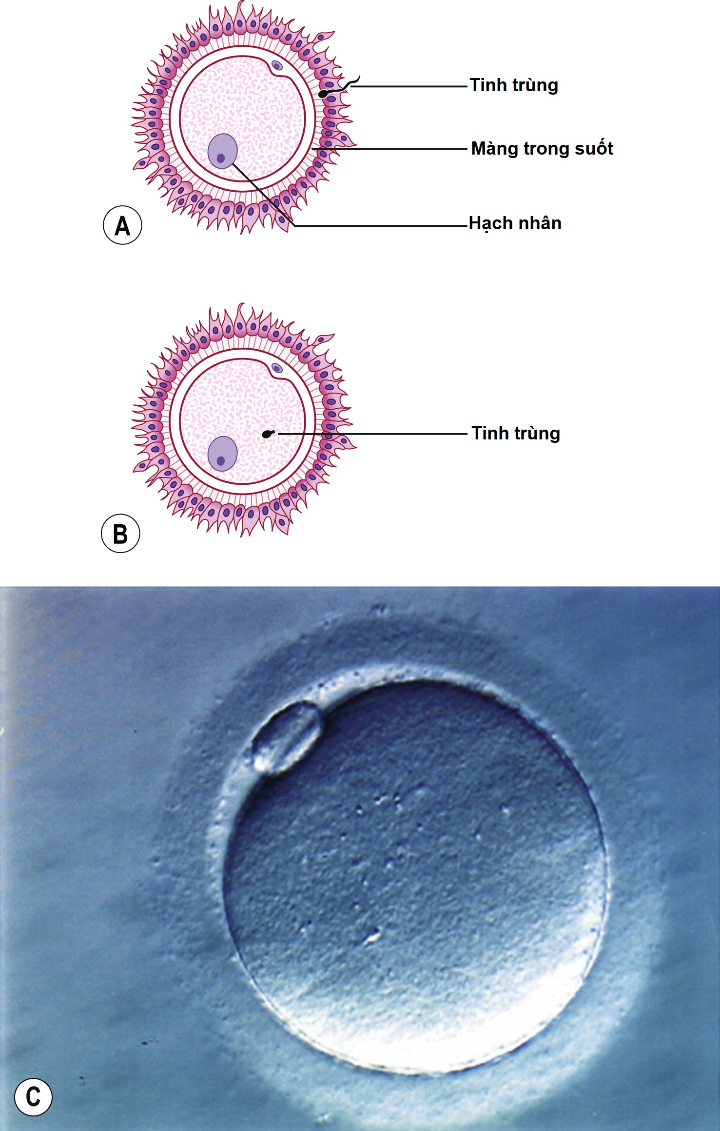 Hình 2.9 (A) Sự bám dính của tinh trùng vào noãn bào khởi đầu phản ứng cực đầu. (B, C) Sự giao phối nhân bao gồm việc đi qua của nhân đầu tinh trùng vào tế bào chất của noãn bào với sự hình thành của hợp tử.