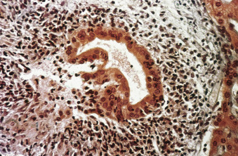 Hình 16.2 Mô bệnh học tổn thương ống mật điển hình giai đoạn I của viêm đường mật tiên phát. Lớp tế bào biểu mô lót một ống mật nhỏ bị thâm nhiễm bởi các tế bào lympho (nhuộm hematoxylin và eosin [H&E]).