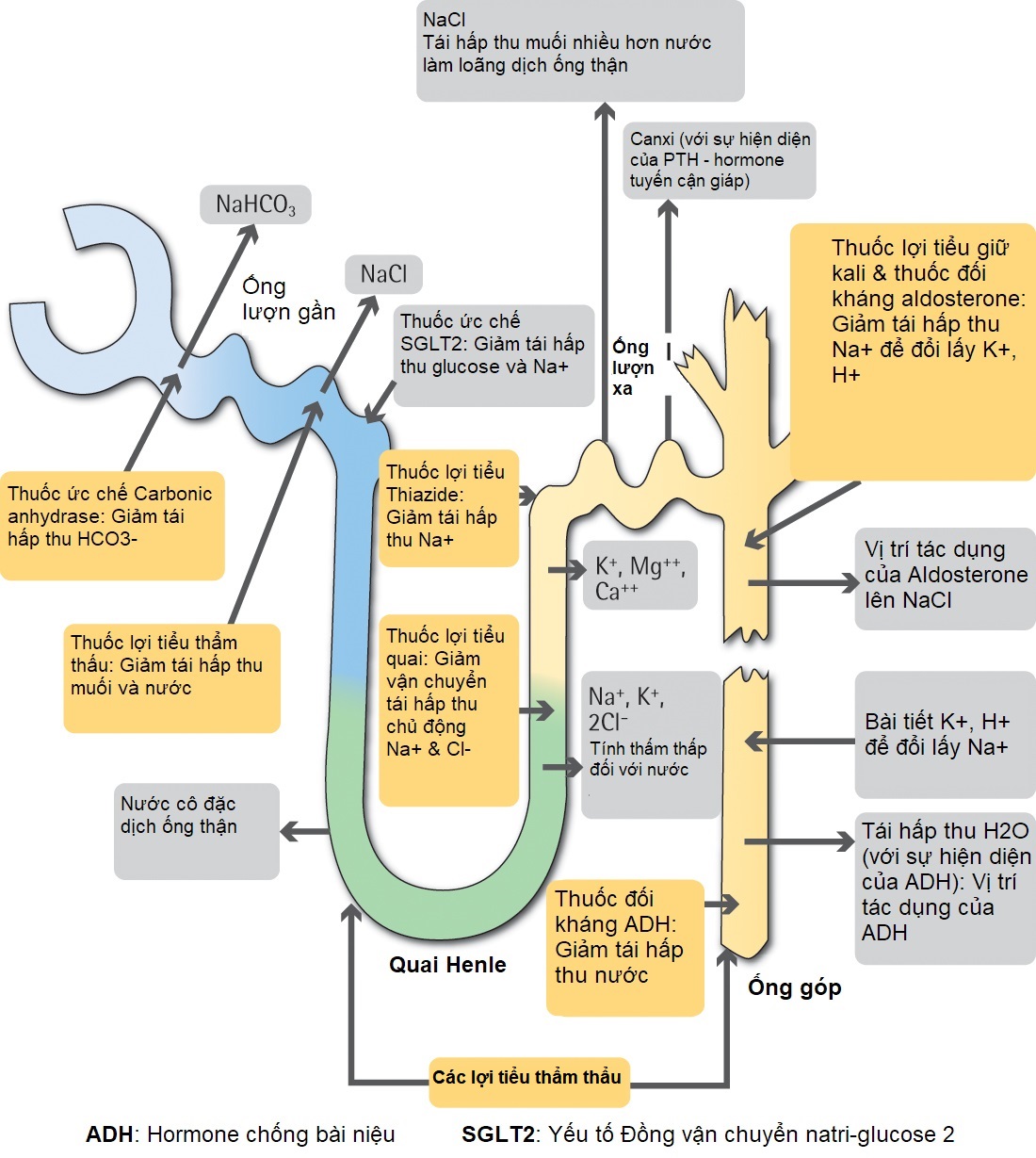 Sơ đồ đơn giản hóa dưới đây minh họa các vị trí quan trọng của sự tái hấp thu điện giải trong nephron và nơi sự tái hấp thu Na+ có thể bị ức chế bởi thuốc lợi tiểu. ¹⁻⁷
