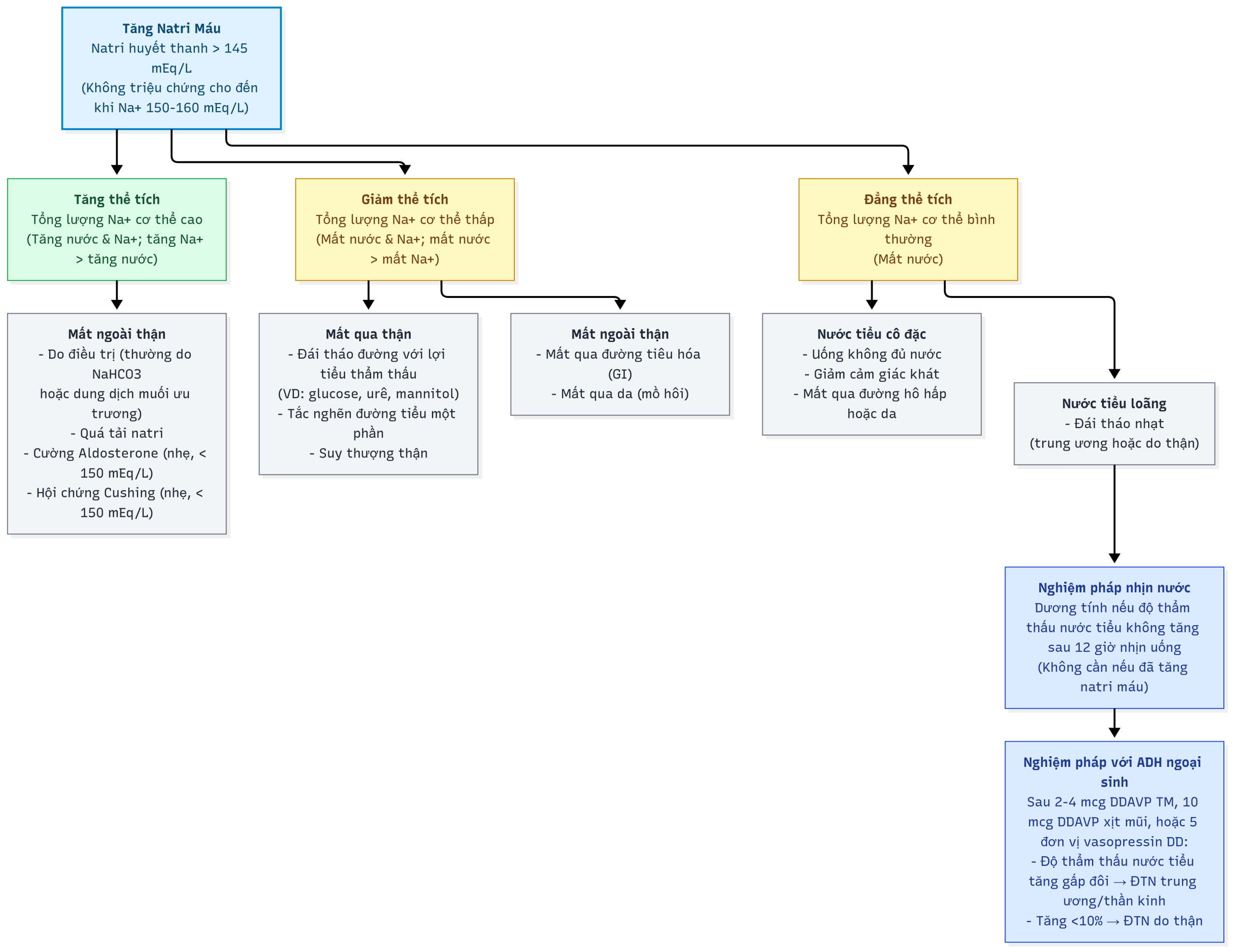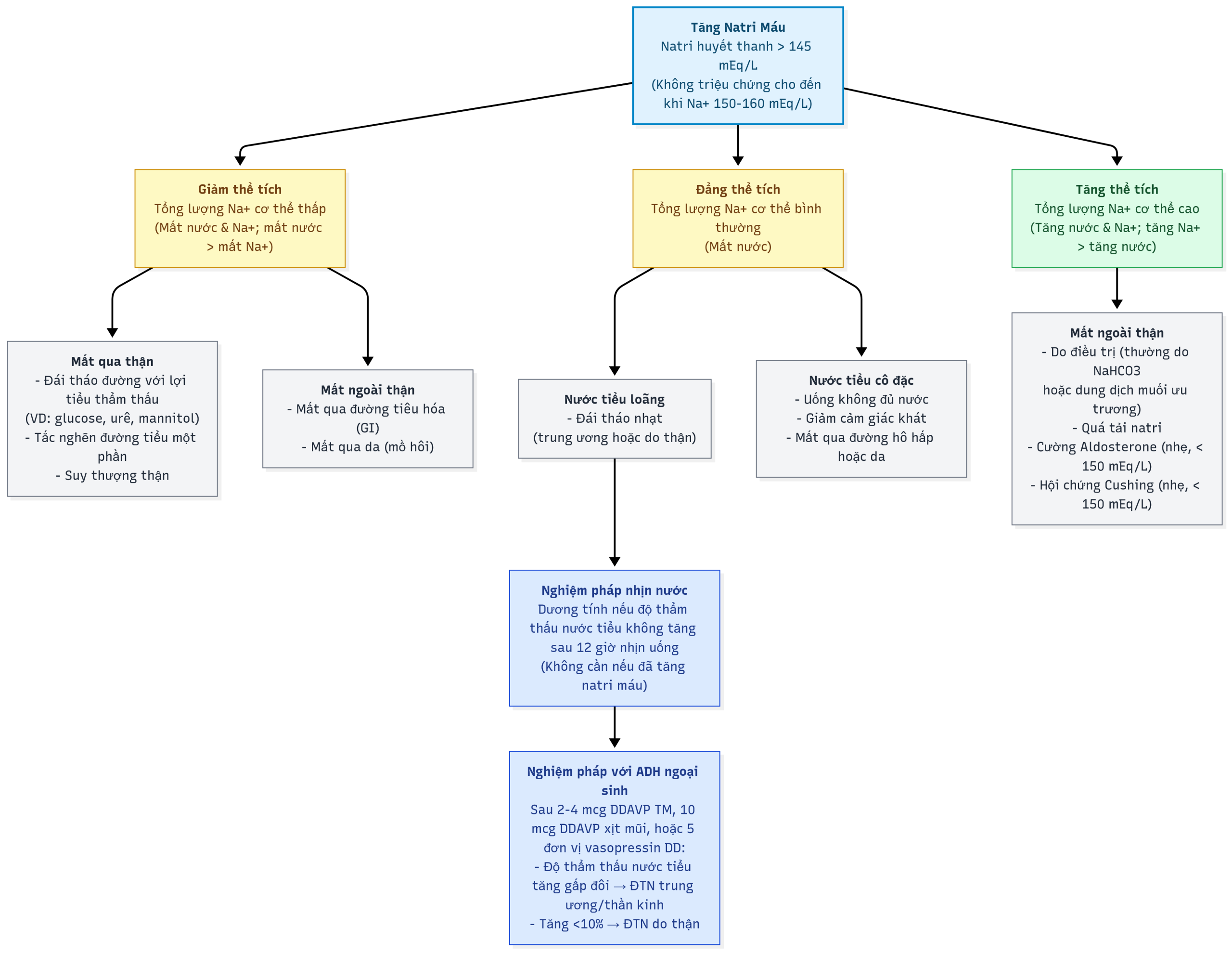 Nguyên nhân của tăng natri máu được chia thành ba loại dựa trên tình trạng thể tích của bệnh nhân, như được trình bày trong sơ đồ dưới đây. Tăng natri máu chỉ xảy ra ở 0.1% đến 0.2% bệnh nhân nhập viện. Nó luôn đi kèm với tình trạng tăng trương lực (tăng áp lực thẩm thấu).