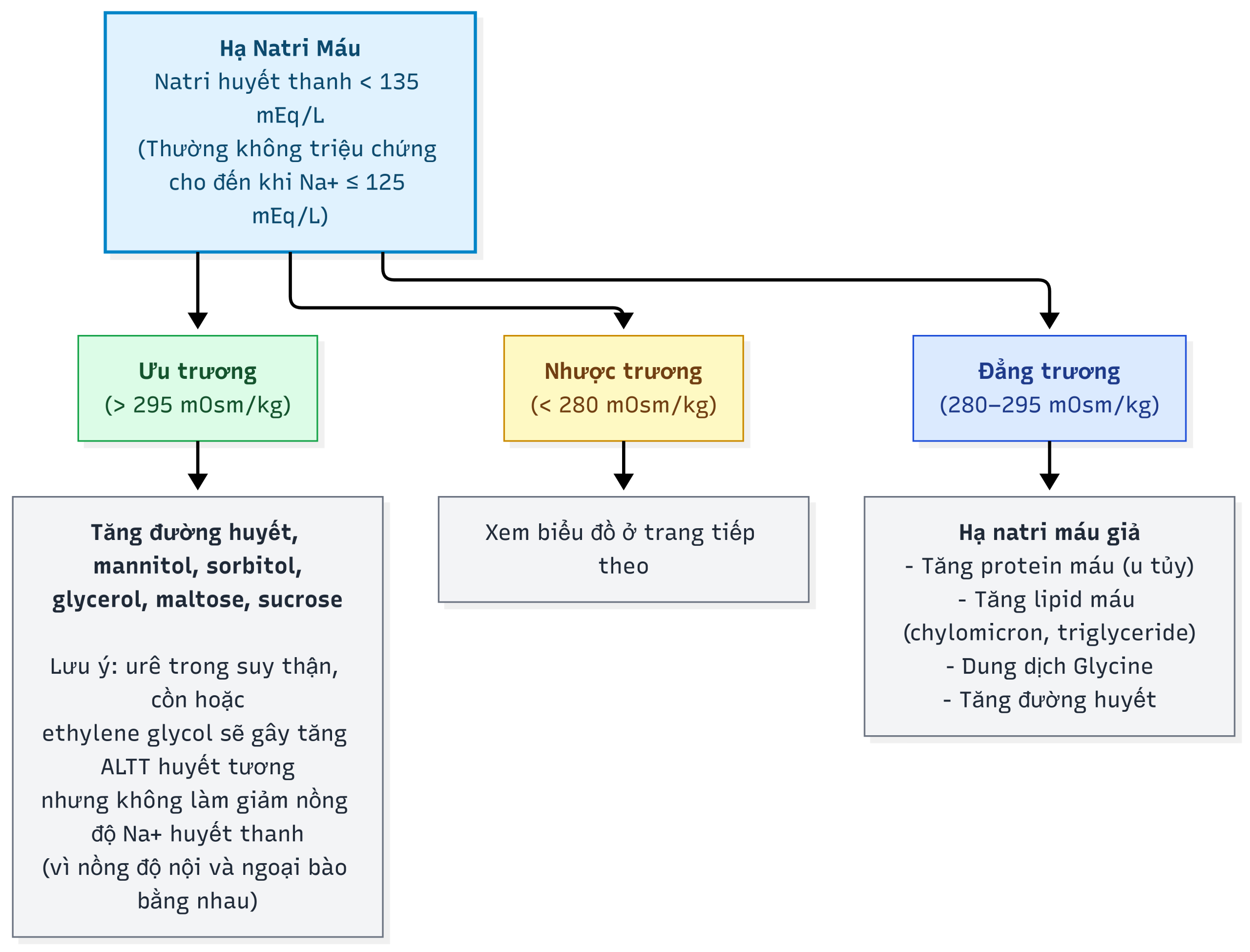 Hạ natri máu tương đối phổ biến, xảy ra ở 1% đến 2% bệnh nhân nhập viện. Không giống như tăng natri máu (luôn đi kèm với tăng trương lực), hạ natri máu có thể đi kèm với giảm trương lực, đẳng trương lực, hoặc tăng trương lực. Để xác định nguyên nhân của hạ natri máu, cần thu thập các thông tin sau: áp lực thẩm thấu huyết tương, tình trạng thể tích của bệnh nhân, nồng độ natri nước tiểu, và áp lực thẩm thấu nước tiểu (Uosm), trong đó Uosm phản ánh sự bài tiết hormone chống bài niệu (ADH). ⁸,⁹,¹²⁻¹⁶