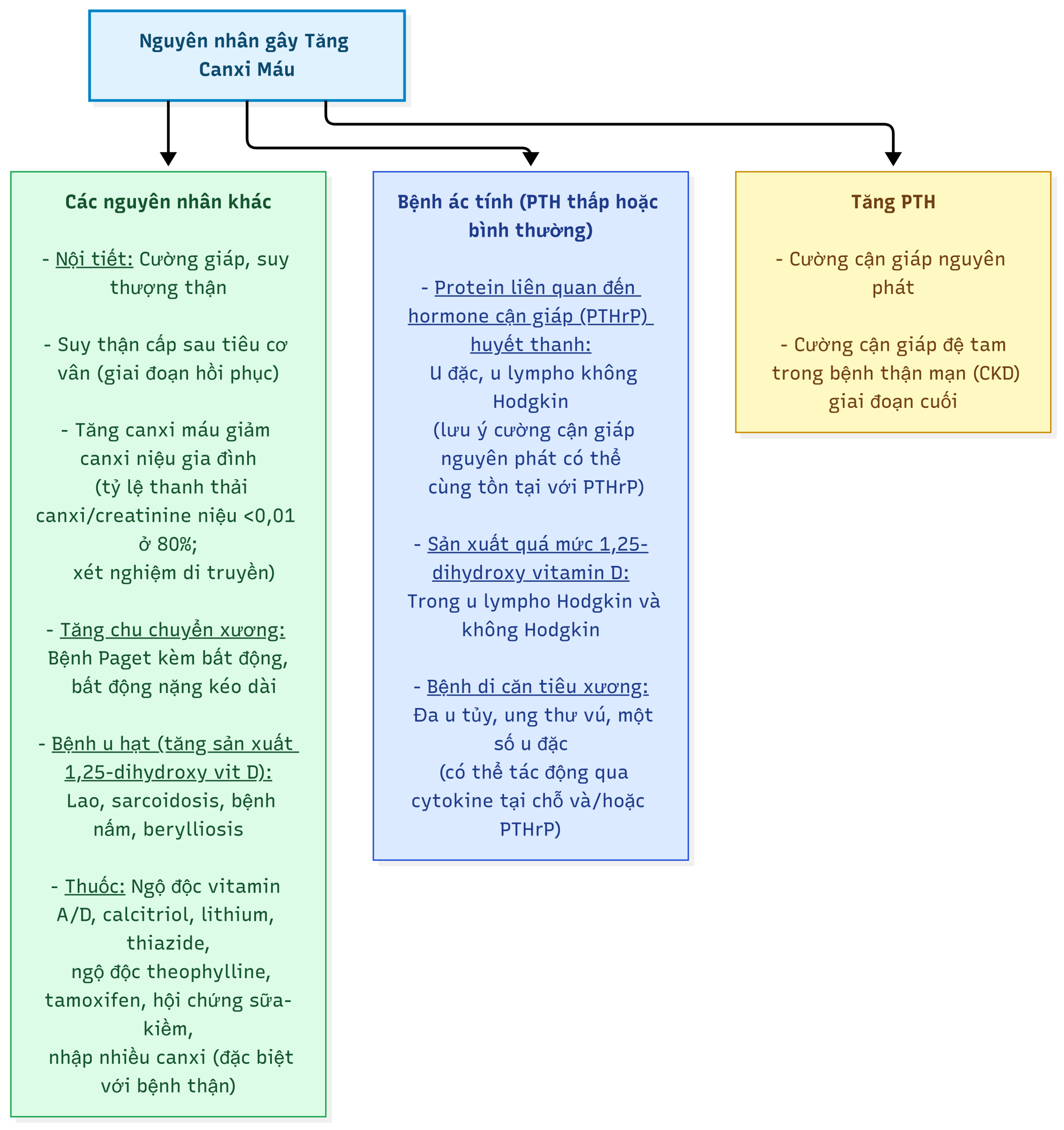 • Thuốc nhuận tràng hoặc thụt tháo chứa phosphat (có thể gây tổn thương thận cấp nặng do bệnh thận do phosphat) | • Suy thận (Giai đoạn > 4) • Ngộ độc vitamin D • Bisphosphonate • Suy cận giáp • Bệnh to đầu chi • Bệnh vôi hóa u gia đình |