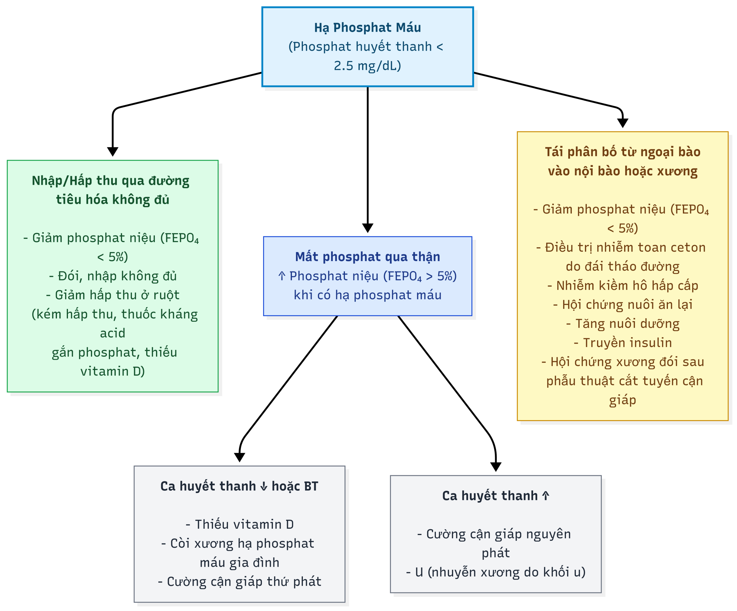 Bổ sung phosphat đường uống là đủ cho hạ phosphat máu nhẹ đến trung bình, nhưng có thể xem xét bù bằng đường IV với 20 đến 30 mmol kali phosphat khi có suy giảm tim hoặc hô hấp, thiếu máu, hoặc nồng độ phosphat < 1.0 mg/dL (0.32 mmol/L).⁶⁷
