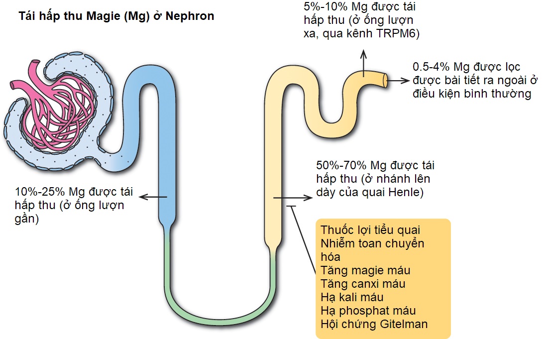 - Mất qua thận: khiếm khuyết ống thận (bẩm sinh hoặc mắc phải), đái tháo đường, nghiện rượu, các loại thuốc ảnh hưởng đến sự hấp thu ở ống thận (lợi tiểu, aminoglycoside, amphotericin, cisplatin, pentamidine, cyclosporine), tăng canxi máu