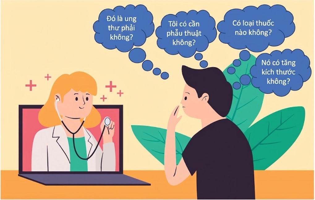 Hình 1.1 Một số mối quan tâm của người bệnh sau khi có chẩn đoán nốt tuyến thượng thận tình cờ. Từ trái sang phải, từ trên xuống dưới: Đó có phải là ung thư không? Tôi có cần phẫu thuật không? Có loại thuốc nào điều trị không? Kích thước của nó có tăng lên không? (Nguồn hình ảnh: Freepik)