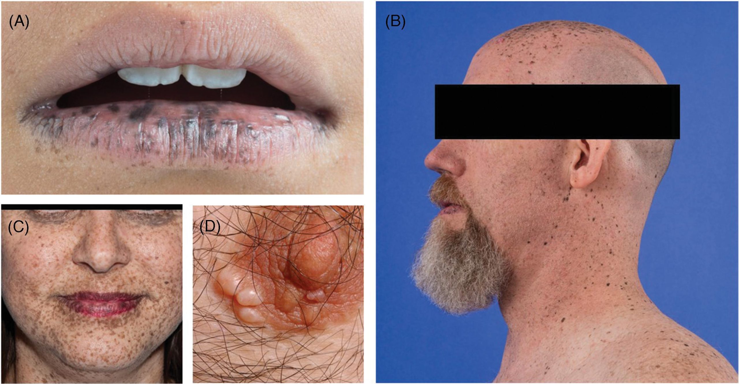 Hình 8.1 Các biểu hiện ngoài da của hội chứng Carney. (A)-(C) Đốm sắc tố da với nhiều nốt rám tàn nhang màu nâu đến đen phân bố ở các vị trí điển hình liên quan đến môi, kết mạc, khóe mắt trong và ngoài cùng với niêm mạc sinh dục. (D) Các u nhầy ngoài da ở quầng vú.