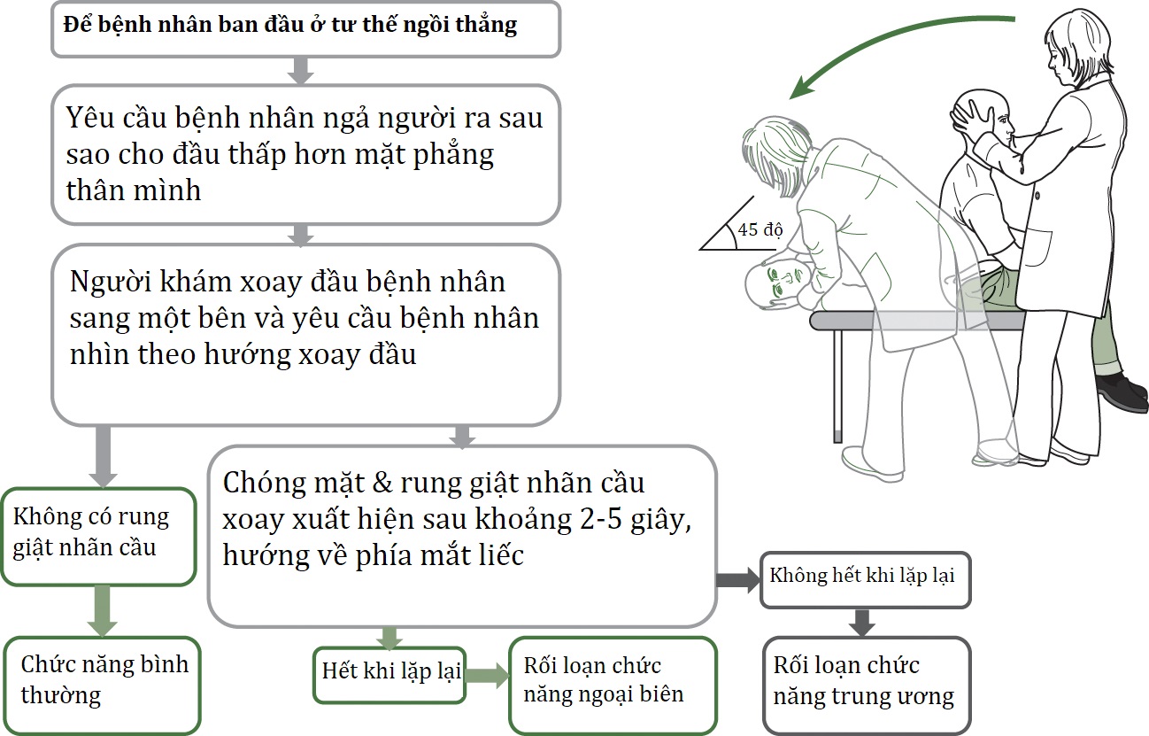 Bệnh nhân ban đầu ngồi thẳng. Bệnh nhân được yêu cầu ngả người ra sau sao cho đầu thấp hơn mặt phẳng thân mình. Người khám xoay đầu bệnh nhân sang một bên và yêu cầu bệnh nhân nhìn theo hướng đầu được xoay. Nếu không có rung giật nhãn cầu, chức năng là bình thường. Nếu chóng mặt và rung giật nhãn cầu xoay xuất hiện sau khoảng 2-5 giây tiềm tàng, về phía mắt bị lệch, cần phân biệt thêm: nếu hết khi lặp lại (fatigable) là rối loạn chức năng ngoại biên; nếu không hết khi lặp lại (non-fatigable) là rối loạn chức năng trung ương.
