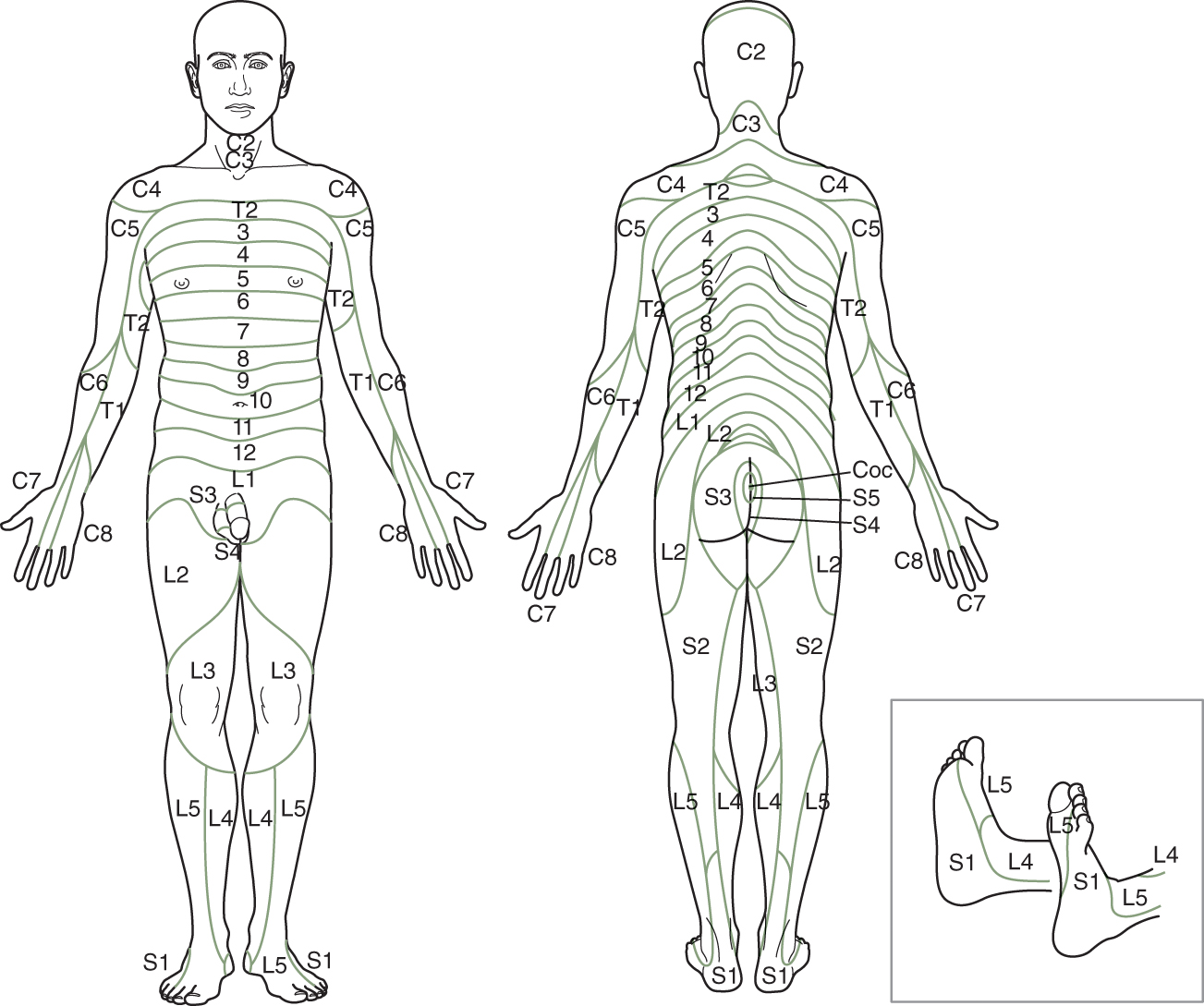 Tham khảo Hình ảnh điện tử 1.8 và 1.9 để biết phân bố cảm giác bình thường theo khoanh da và dây thần kinh ngoại biên. Đánh giá hệ thống cảm giác đòi hỏi phải kiểm tra cả cảm giác nông (sờ nhẹ, đau và nhiệt độ) và cảm giác sâu (liên quan đến nhận cảm tư thế và rung từ các cấu trúc sâu, chẳng hạn như cơ, dây chằng và xương).