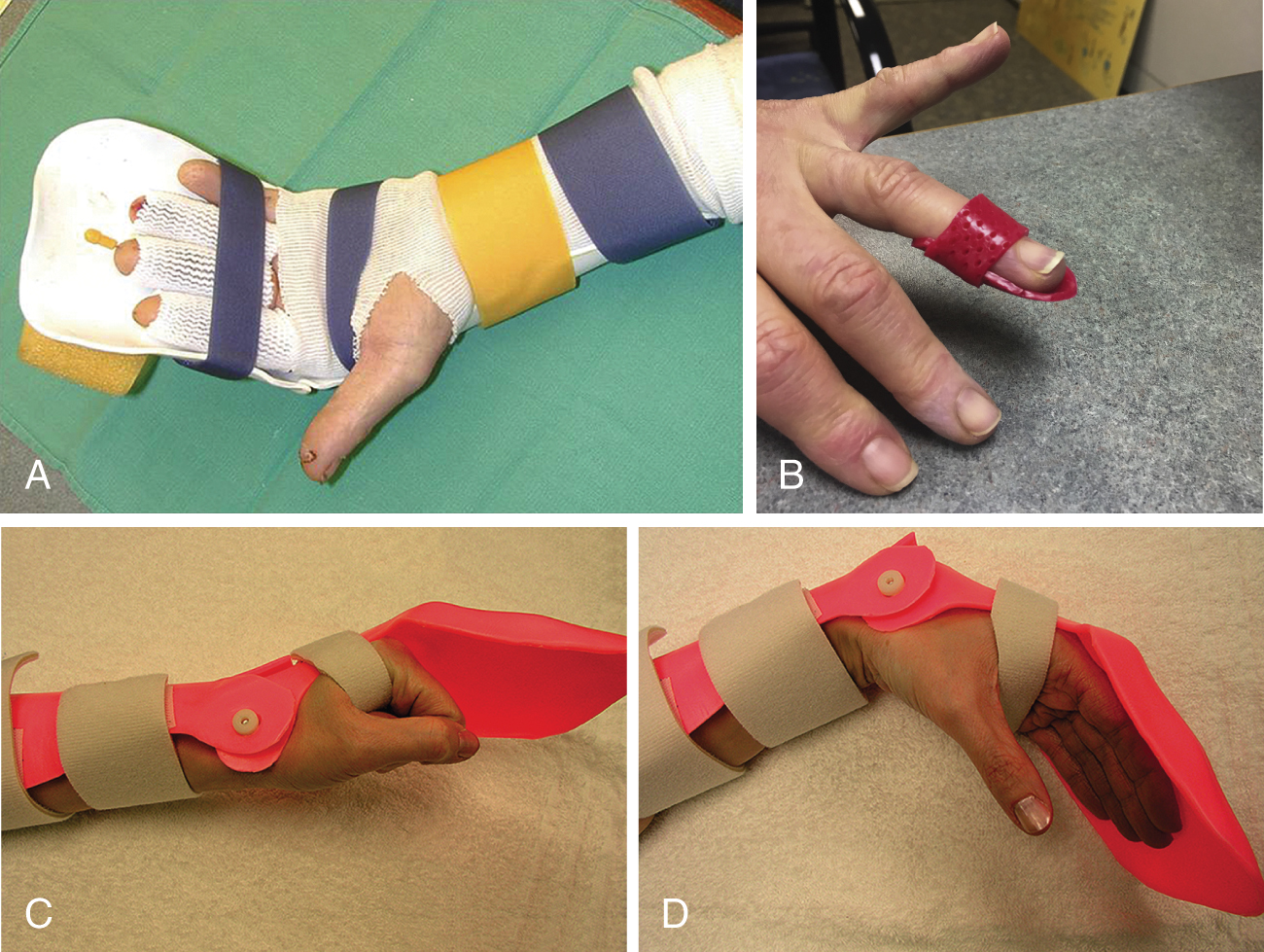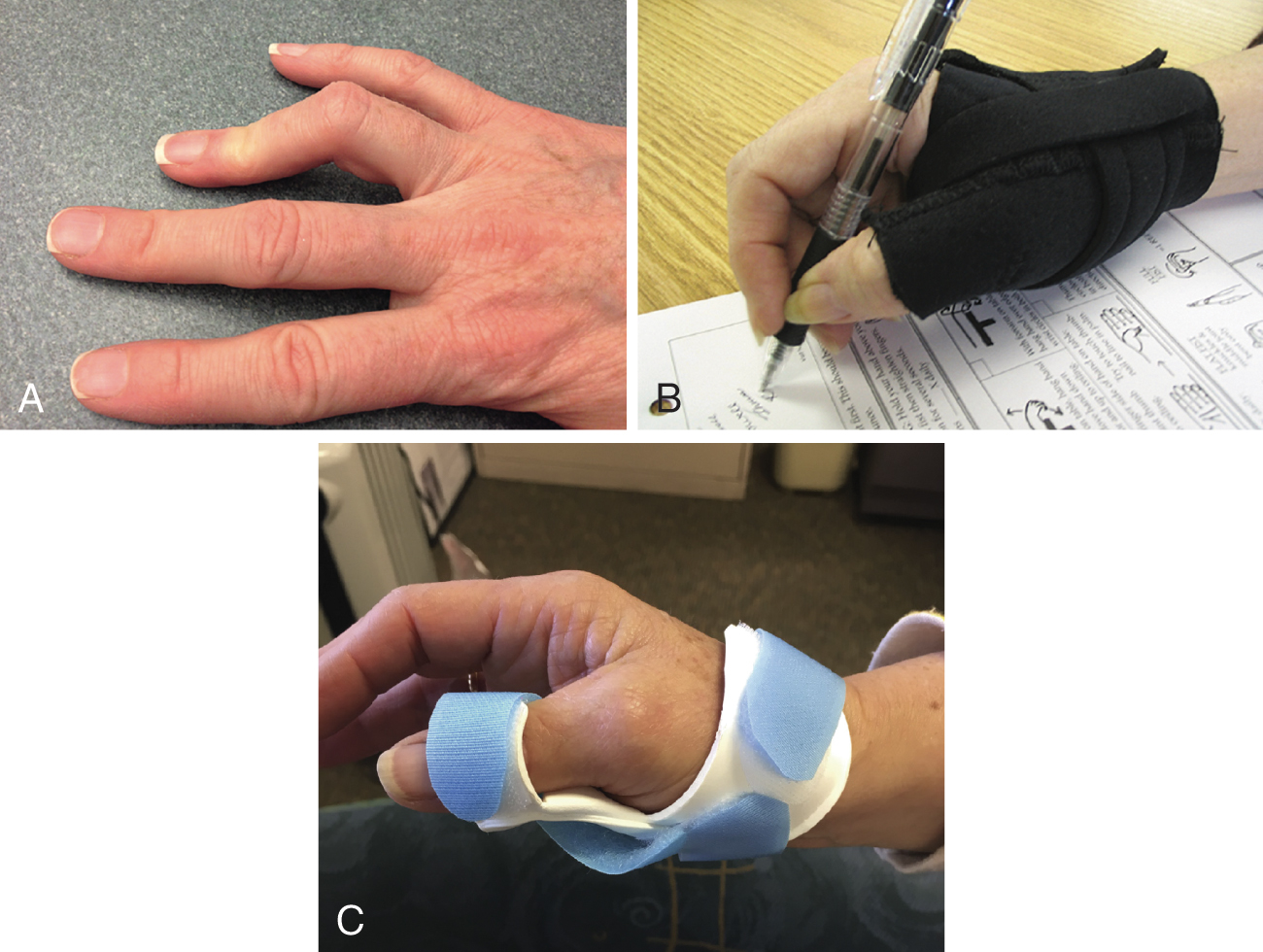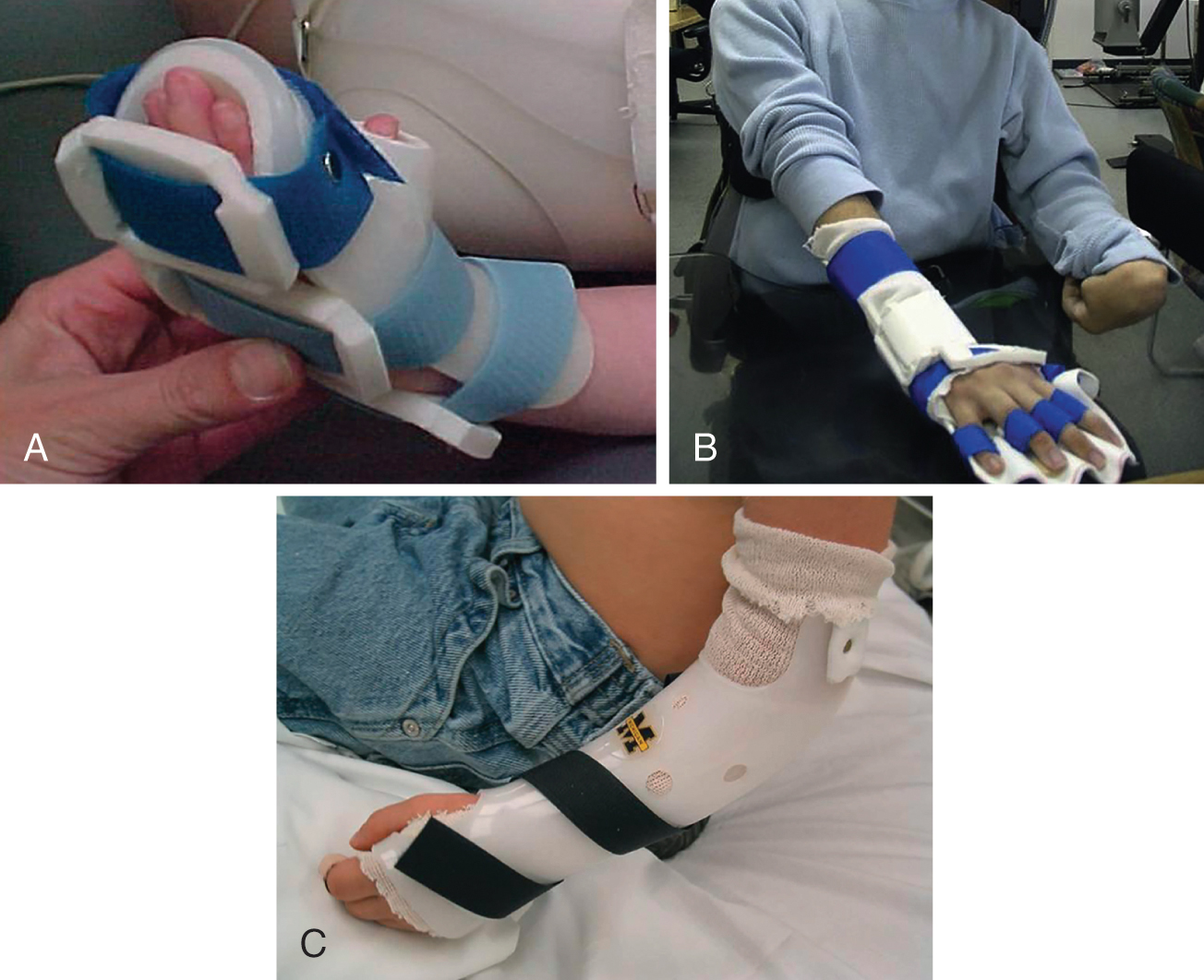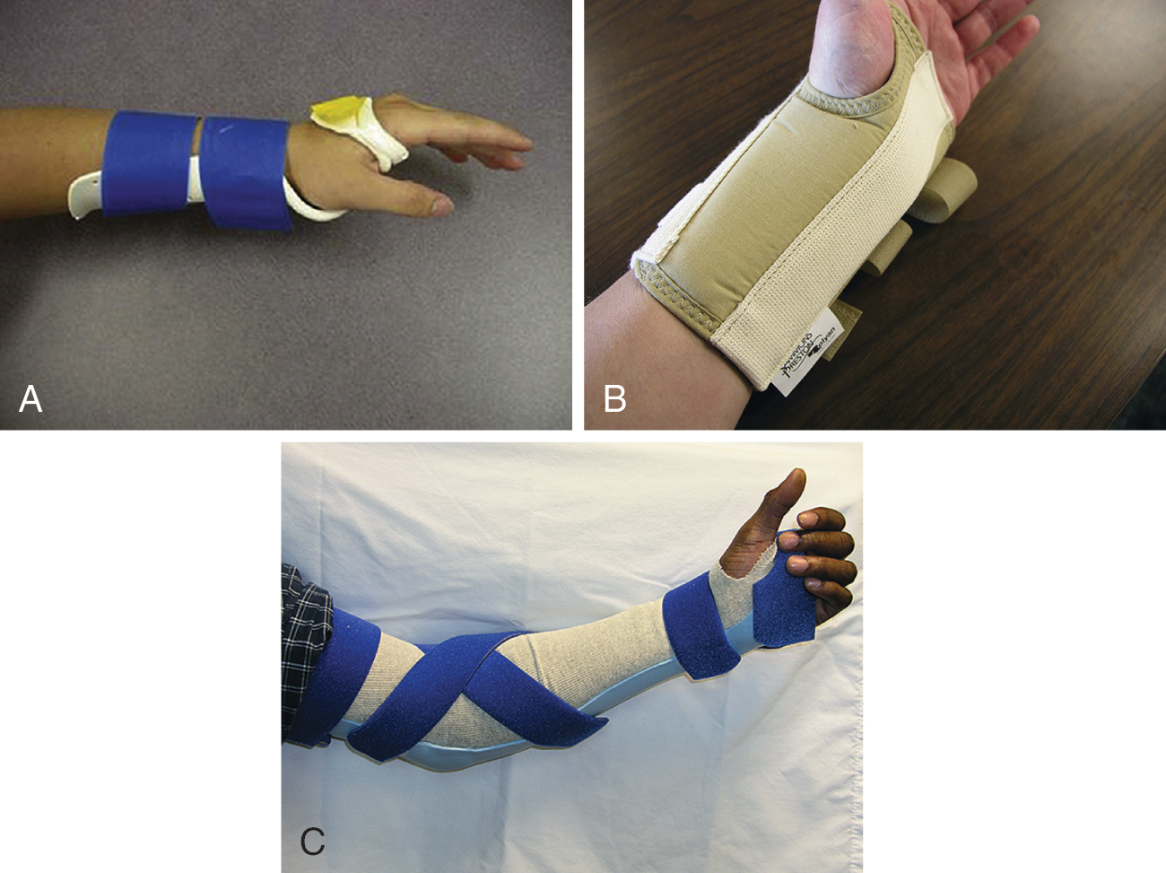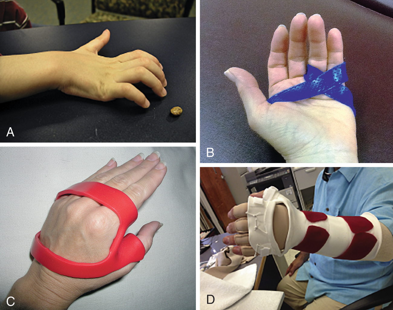 • Bàn tay được sử dụng trong các hoạt động chức năng thông qua các kiểu cầm nắm cơ bản: để kẹp, nắm hoặc móc các vật thể. Đối với cầm nắm mạnh, cổ tay được giữ ở tư thế duỗi với các ngón tay quấn quanh một vật thể trong lòng bàn tay. Cầm nắm hình cầu hữu ích để giữ một quả bóng. Kiểu móc hữu ích để mang các vật nặng. Đối với cầm nắm chính xác, ngón cái được giữ dựa vào đầu ngón trỏ và ngón giữa. Nẹp bàn tay chức năng nhằm mục đích cải thiện việc kẹp. Trong ba loại kẹp (kẹp đối, kẹp chính xác và kẹp bên), tốt nhất là nẹp bàn tay theo hướng kẹp đối. Điều này cho phép sự cân bằng tốt nhất giữa kẹp chính xác tinh vi và kẹp bên mạnh mẽ. Dụng cụ chỉnh hình nên được chế tạo ở một vị trí giúp tăng cường khả năng cầm nắm và không buộc ngón cái vào tư thế duỗi và dạng quay để tránh phần còn lại của cánh tay phải bù trừ cho vị trí ngón cái kém.