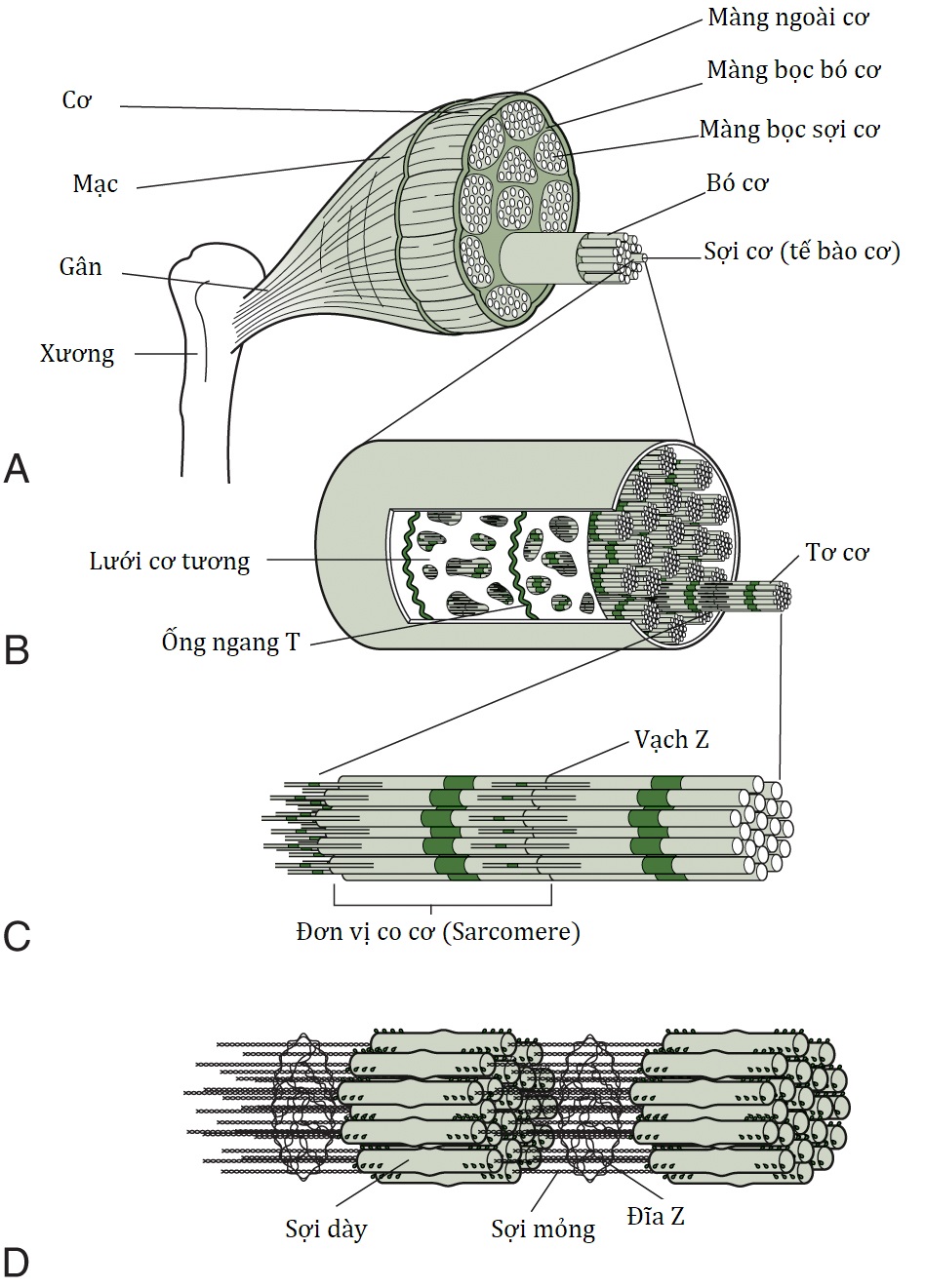 Hình e15.5: Cấu trúc của Cơ Xương. A. Cơ quan cơ xương: bao gồm các bó sợi cơ co được giữ lại với nhau bằng mô liên kết. B. Tơ cơ: bao gồm mỗi sợi cơ lơ lửng trong tương cơ. Lưu ý lưới cơ tương và ống T tạo thành cấu trúc ba phần gọi là bộ ba. C. Sarcomere: giữa các vạch Z. Một tơ cơ được phóng đại để cho thấy sarcomere giữa các vạch Z kế tiếp. D. Cấu trúc phân tử của một tơ cơ: cho thấy các sợi tơ dày và sợi tơ mỏng.