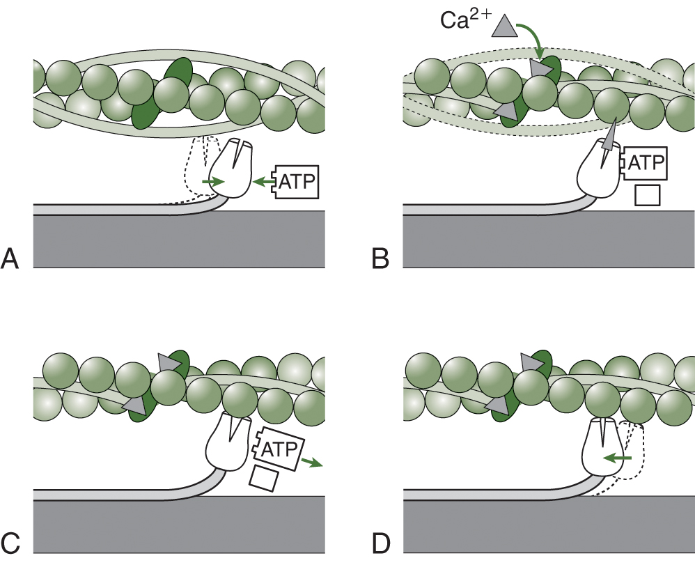 Cơ chế trượt sợi của sự co cơ được thể hiện trong Hình e15.6. Ở cấp độ phân tử, khi canxi được giải phóng từ lưới cơ tương, nó liên kết với troponin C, làm lộ ra các vị trí hoạt động của actin bị che khuất bởi phức hợp troponin-tropomyosin, cùng với sự giải phóng ATP ở các đầu myosin, dẫn đến sự co cơ.
