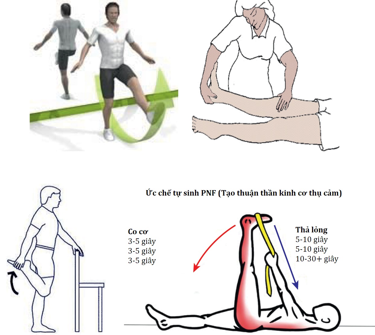Hệ Adenosine triphosphate-creatine phosphate: yếm khí; 30 giây cho chạy nước rút hoặc cử tạ Hệ Đường phân yếm khí/axit lactic: 1.5 đến 2 phút cho chạy nước rút cự ly trung bình hoặc cử tạ Hệ oxy hóa hiếu khí: >30 phút cho chạy đường dài Bài tập Tim mạch Khi nghỉ, đến Kê đơn Bài tập Các thành phần: phương thức, cường độ, thời lượng, tần suất, sự tiến triển Cần có sự cho phép y tế đối với bệnh nhân bị bệnh tim, rối loạn nhịp tim và các hạn chế về phổi Sinh lý Cơ Loại sợi cơ đặc hiệu cho hệ thống trao đổi chất/năng lượng được sử dụng Các loại co cơ: đẳng trường, đẳng trương, đồng tâm, lệch tâm, đẳng động Lực co tối đa khi cơ ở chiều dài nghỉ bình thường Sự tăng sức mạnh ban đầu trong tập luyện kháng trở là do sự thích ứng thần kinh cơ, sau đó là phì đại cơ xảy ra trong 6 đến 7 tuần Độ dẻo – Các phương pháp Kéo giãn Ballistic (Nảy): nảy/giật lặp đi lặp lại, nhanh Thụ động: người hỗ trợ thực hiện kéo giãn Tĩnh: lực ổn định trong 15 đến 60 giây Các Kỹ thuật Tạo thuận Thần kinh cho Rối loạn Chức năng Hệ Thần kinh Trung ương Tạo thuận thần kinh cơ cảm thụ bản thể: các mẫu xoắn ốc/chéo Brunnstrom: các phản ứng tư thế nguyên thủy cho các mẫu đồng vận Bobath: các mẫu ức chế phản xạ để giảm tăng trương lực cơ Bài tập cho các Đối tượng Đặc biệt Béo phì: hạn chế calo cộng với hoạt động trên cạn cường độ vừa phải 30 đến , ít nhất hai lần một tuần Mang thai: tránh tư thế nằm ngửa sau tam cá nguyệt đầu tiên, nghiệm pháp Valsalva, nguy cơ cao bị ngã hoặc chấn thương bụng, lặn biển Người cao tuổi: trị liệu dưới nước, yoga, thái cực quyền, pilates Trẻ em: năng động nhưng lưu ý các chấn thương do quá tải và tổn thương các sụn tăng trưởng Đái tháo đường: mang giày phù hợp, theo dõi chặt chẽ mức đường huyết, có bạn tập Tăng huyết áp: tránh nếu huyết áp (BP) lúc nghỉ > 200/110; khi tập, giữ Bệnh mạch máu ngoại biên: các bài tập chịu trọng lượng nếu dung nạp được Hội chứng đau cân cơ và đau xơ cơ: bài tập hiếu khí cường độ thấp ban đầu với kéo giãn Ghép tạng: đáp ứng nhịp tim (HR) sau ghép tim không đáng tin cậy; sử dụng Thang đo Mức độ Cảm nhận Gắng sức Borg |