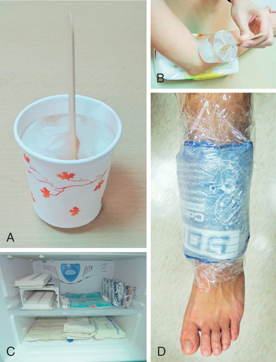Hình 17.1 Liệu pháp lạnh (a) Làm một que đá để xoa bóp bằng cách đặt một que đè lưỡi vào cốc nước đóng băng. (b) Xoa bóp mô bằng que đá (làm từ [a]) theo hình tròn hoặc theo chiều dọc. (c) Các loại túi chườm lạnh khác nhau được bảo quản trong tủ lạnh. (d) Túi chườm lạnh được tạo hình để vừa vặn với vùng bị thương.