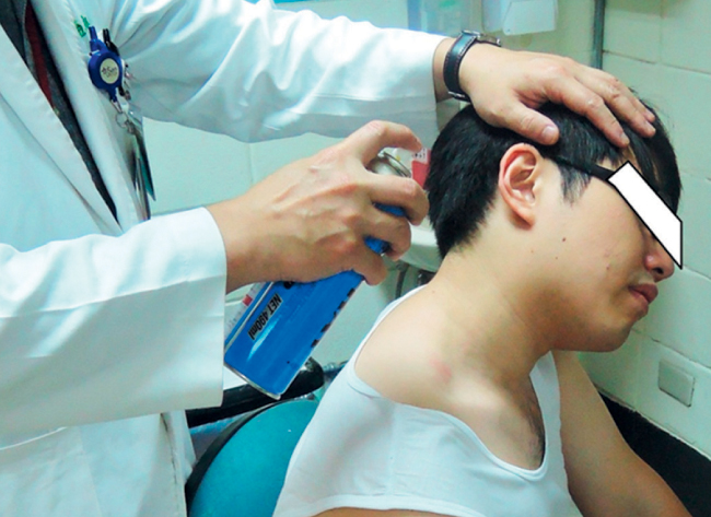 Hình 17.6 Thiết bị nhiệt trị liệu siêu âm (a) Một thiết bị siêu âm thương mại (b) Ứng dụng trên một bệnh nhân bị viêm lồi cầu ngoài xương cánh tay Siêu âm thường được áp dụng trên một vùng mục tiêu bằng kỹ thuật di chuyển đầu dò, cho phép phân bố năng lượng đều hơn. Đầu dò siêu âm được di chuyển trên một diện tích khoảng 25 cm² (4 in²) một cách chậm rãi theo hình tròn hoặc theo chiều dọc trong 5 đến 10 phút.