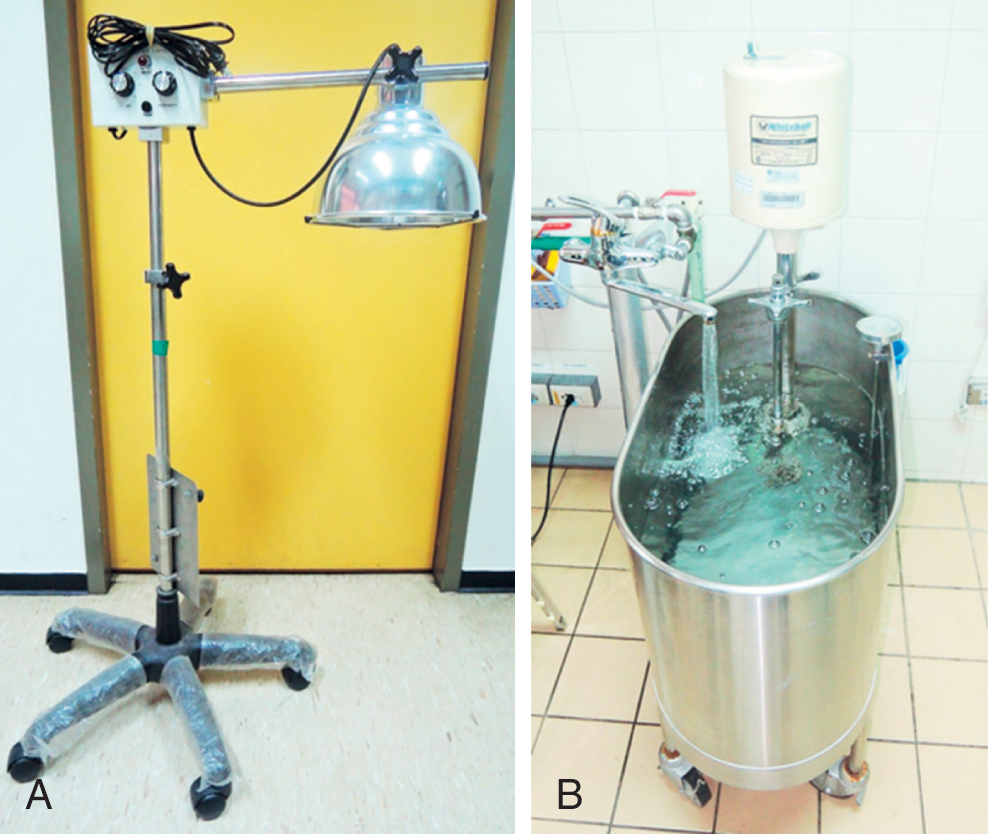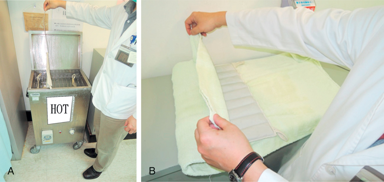 Hình 17.3 Túi chườm nóng thương mại (a) Các túi chườm nóng Hydrocollator được bảo quản trong một bể chứa. (b) Kỹ thuật quấn túi chườm nóng hydrocollator; cần có nhiều lớp khăn để tránh bệnh nhân bị bỏng.