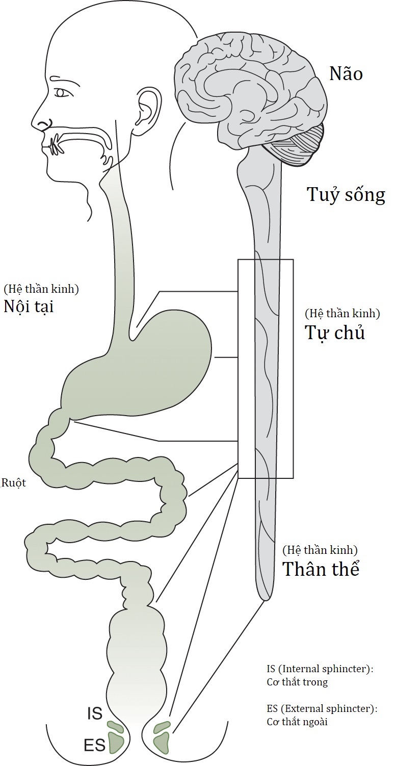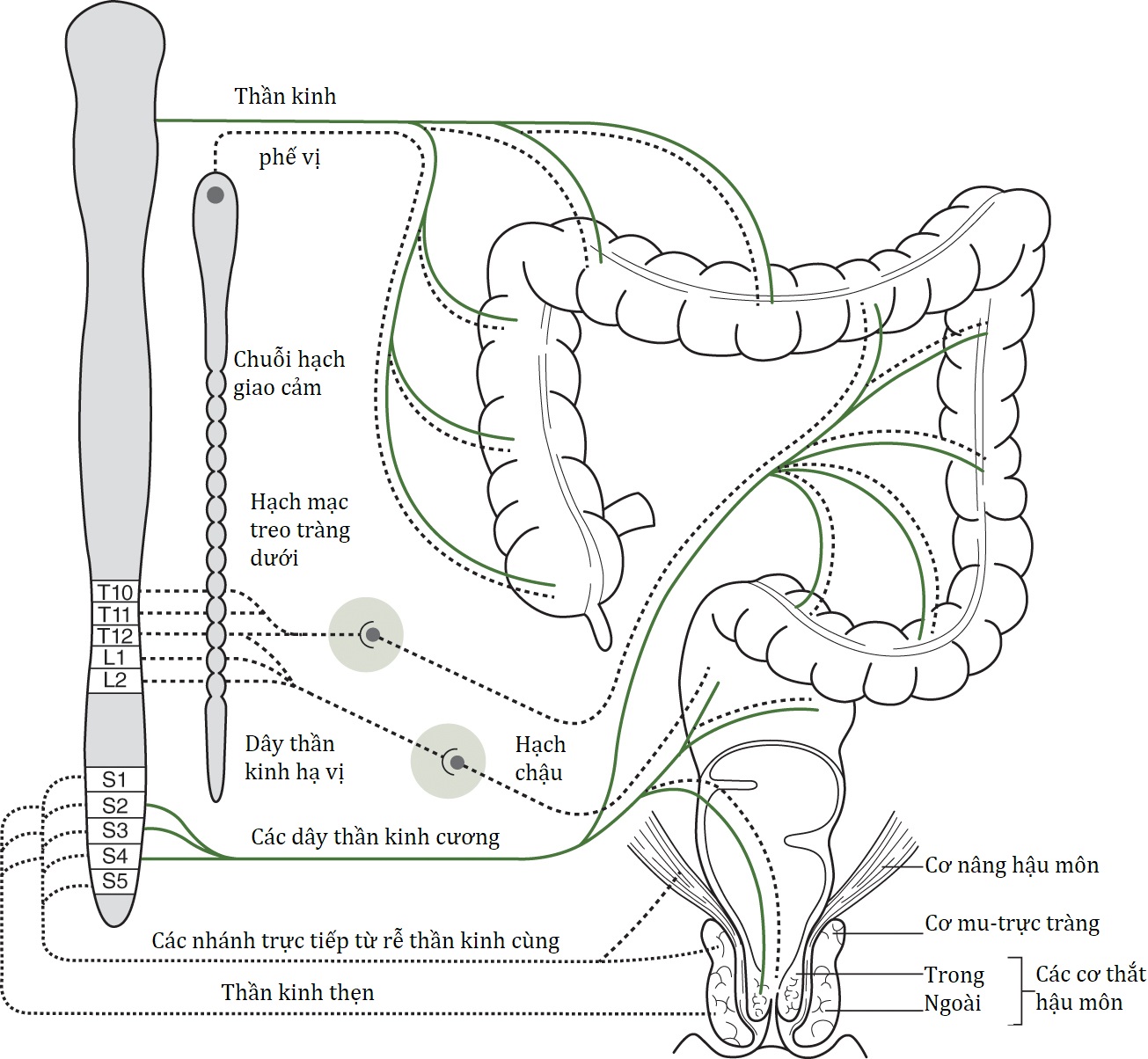- Trực tràng và ống hậu môn: duy trì sự tự chủ về phân bao gồm sự phối hợp của các cơ sàn chậu (tức là cơ nâng hậu môn), tạo thành một vòng treo quanh trực tràng, và cơ chế cơ thắt hậu môn bao gồm IAS, cơ thắt hậu môn ngoài (External Anal Sphincter – EAS), và cơ mu-trực tràng. EAS (được chi phối bởi các rễ thần kinh S2-S4 qua dây thần kinh thẹn) và cơ mu-trực tràng (được chi phối bởi các nhánh trực tiếp từ các rễ S1-S5) là những cơ vân duy nhất có trạng thái nghỉ ngơi bình thường là co cứng. Áp lực ống hậu môn lúc nghỉ phần lớn được quyết định bởi góc tại chỗ nối hậu môn-trực tràng do vòng treo mu-trực tràng và trương lực cơ thắt trong tạo ra; chỉ có 20% áp lực là do EAS được kiểm soát theo ý muốn.