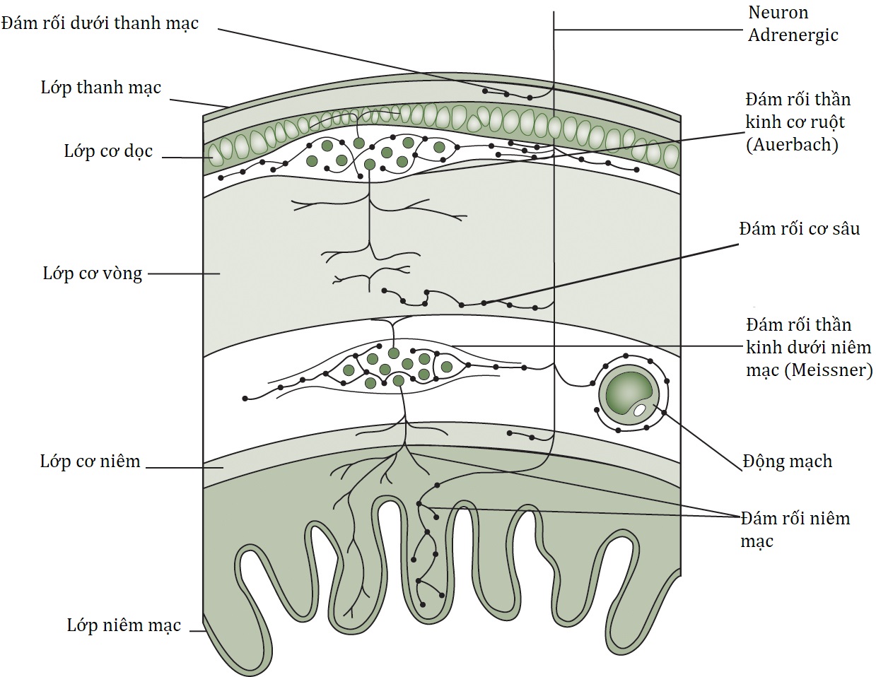 Chức năng bình thường của đường tiêu hóa đòi hỏi sự phối hợp của co bóp cơ, hấp thụ chất dinh dưỡng và điều hòa lưu lượng máu, được chi phối bởi hệ thần kinh ruột (ENS) bao gồm các neuron nằm dọc theo thành ruột từ thực quản đến cơ thắt hậu môn trong (Internal Anal Sphincter – IAS). ENS được điều hòa bởi hệ thần kinh trung ương (CNS), bao gồm các neuron trong não và tủy sống, và hệ thần kinh tự chủ (ANS), bao gồm các neuron trong các hạch giao cảm và phó giao cảm (Hình 21.1 và 21.2).