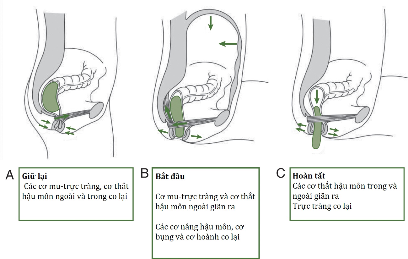 Đại tiện bình thường bắt đầu bằng sự căng của trực tràng-sigma do khoảng 200 mL phân. Hai phản xạ xuất hiện sau khi trực tràng-sigma căng do một khối phân: