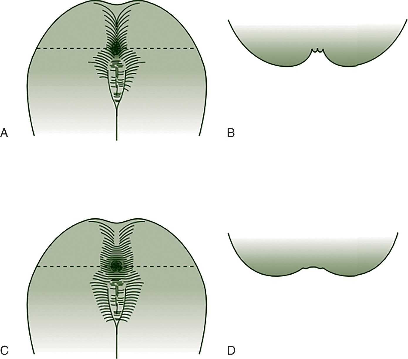 - Giảm trương lực hậu môn, không sờ thấy gờ cơ mu-trực tràng, và ống hậu môn bị rút ngắn Khám thực thể ở bệnh nhân LMNB, trái ngược với bệnh nhân UMNB, cho thấy (bình thường, dài 2,5-4,5 cm) khi thăm khám bằng ngón tay, một đường viền phẳng và giống như vỏ sò khi kiểm tra từ hậu môn đến mông, và các phản xạ cùng bị mất hoặc giảm (phản xạ da-hậu môn và phản xạ hành hang) (xem Hình 21.8).