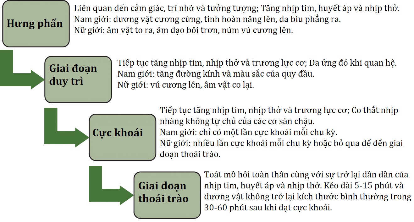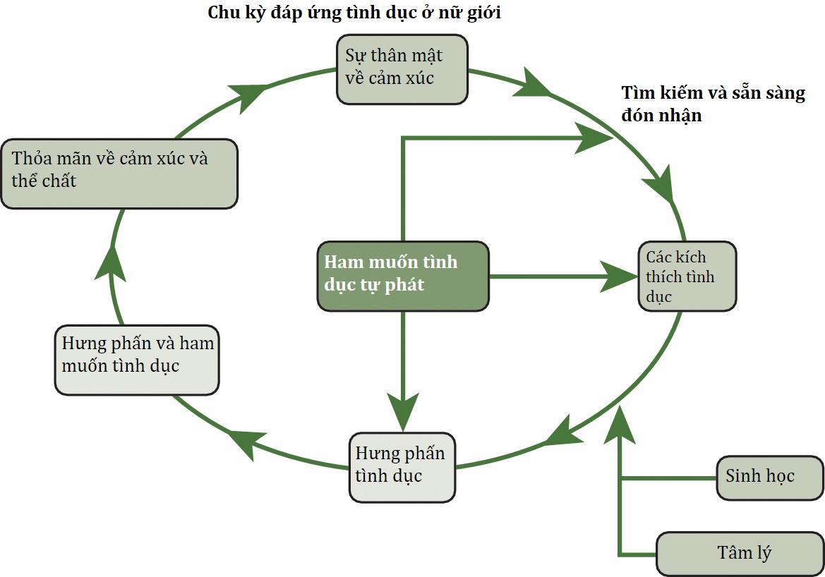Mô hình cổ điển về phản ứng tình dục của con người của Masters và Johnson mô tả phụ nữ và nam giới có phản ứng tình dục tương tự nhau, cụ thể là bốn giai đoạn: kích thích, bình nguyên, cực khoái và giải tỏa (Hình 22.1); tuy nhiên, họ đã ghi nhận sự khác biệt giữa hai giới. Ví dụ, nam giới có xu hướng trải qua mỗi giai đoạn nhanh hơn và có một cơn cực khoái mỗi chu kỳ, trong khi phụ nữ có thể đạt được nhiều cơn cực khoái trong cùng một chu kỳ. Họ cũng lưu ý rằng phụ nữ có thể bị “kẹt” ở giai đoạn bình nguyên, do đó chuyển thẳng đến giai đoạn giải tỏa mà không có cực khoái. Mô hình phản ứng tình dục của Kaplan mô tả ba giai đoạn: ham muốn, kích thích và cực khoái. Ham muốn là “cảm giác cụ thể thúc đẩy các cá nhân bắt đầu hoặc đáp ứng với kích thích tình dục,” luôn đi trước sự hưng phấn. Cả hai mô hình đều bỏ qua các thành phần chính của sự thỏa mãn tình dục của phụ nữ như tầm quan trọng của sự tin tưởng, thân mật, tình cảm, tôn trọng và giao tiếp. Mô hình vòng tròn của Basson về phản ứng tình dục của phụ nữ (Hình 22.2) nhấn mạnh rằng phản ứng tình dục ở phụ nữ phức tạp hơn nhiều so với nam giới.