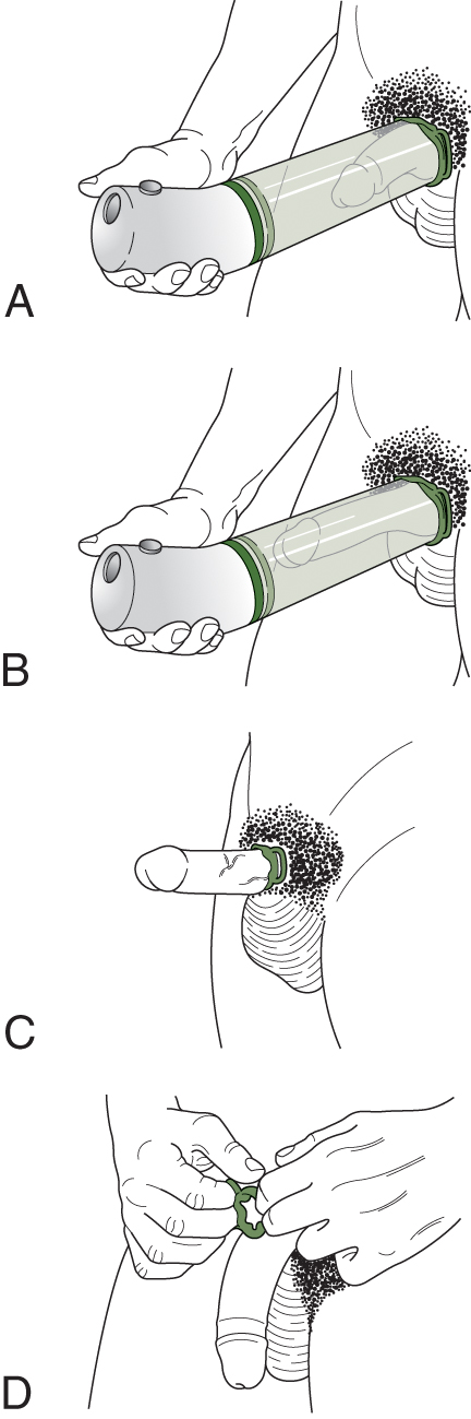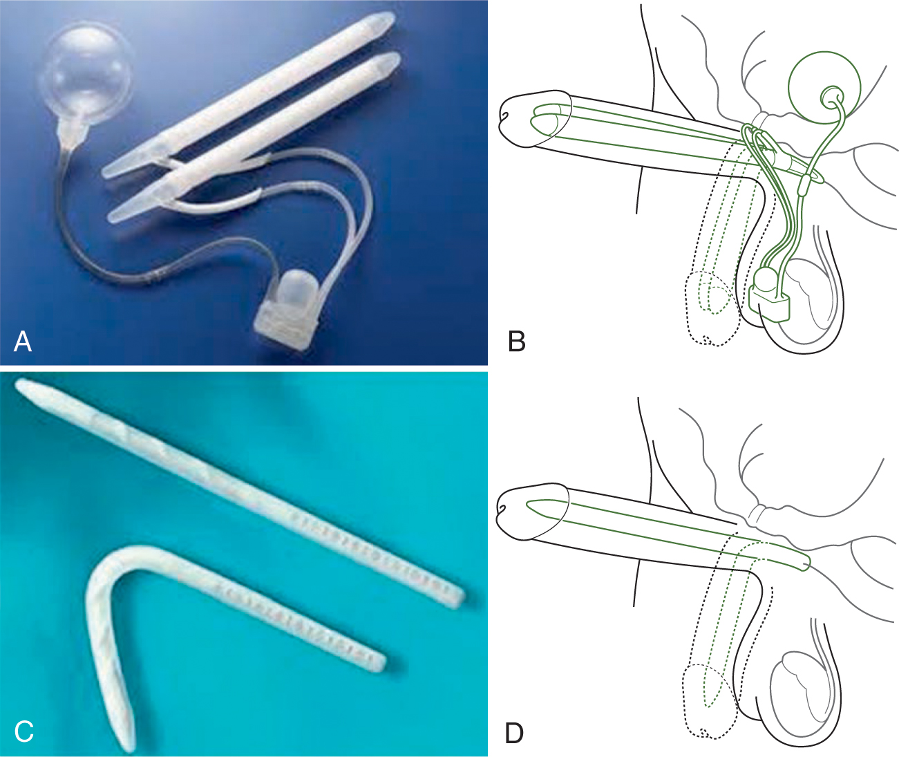 Liệu pháp alprostadil trong niệu đạo với hệ thống MUSE có thể là một giải pháp thay thế cho những bệnh nhân không thể dùng chất ức chế PDE5 và không muốn thử thêm liệu pháp tiêm vào thể hang (Hình 22.14). Các thiết bị co thắt chân không (Hình 22.15) có tỷ lệ hiệu quả cao tới 90%, nhưng tỷ lệ hài lòng có xu hướng thấp do sự xuất hiện không tự nhiên của sự cương cứng, đau dương vật và tinh dịch bị kẹt. Các thiết bị co thắt bị chống chỉ định ở những bệnh nhân có tiền sử rối loạn chảy máu nặng, cương đau dương vật, hoặc cong dương vật nghiêm trọng. Các phương pháp điều trị hàng thứ ba cho ED bao gồm các lựa chọn phẫu thuật như dụng cụ giả dương vật (Hình 22.16). Nghiên cứu về phương pháp điều trị thay thế cho ED bằng liệu pháp tế bào gốc và độc tố thần kinh botulinum hiện đang được tiến hành.