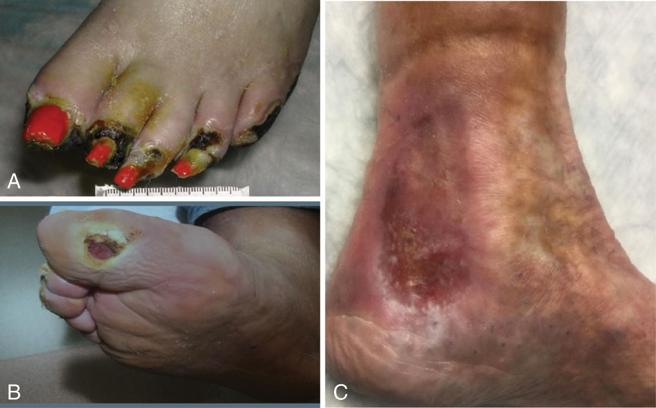 Quản lý bao gồm giải quyết (1) các yếu tố nguy cơ, (2) phục hồi lưu lượng máu ngoại biên (nội mạch hoặc phẫu thuật), (3) cắt lọc bảo tồn, (4) kiểm soát đau, và (5) chăm sóc vết thương.