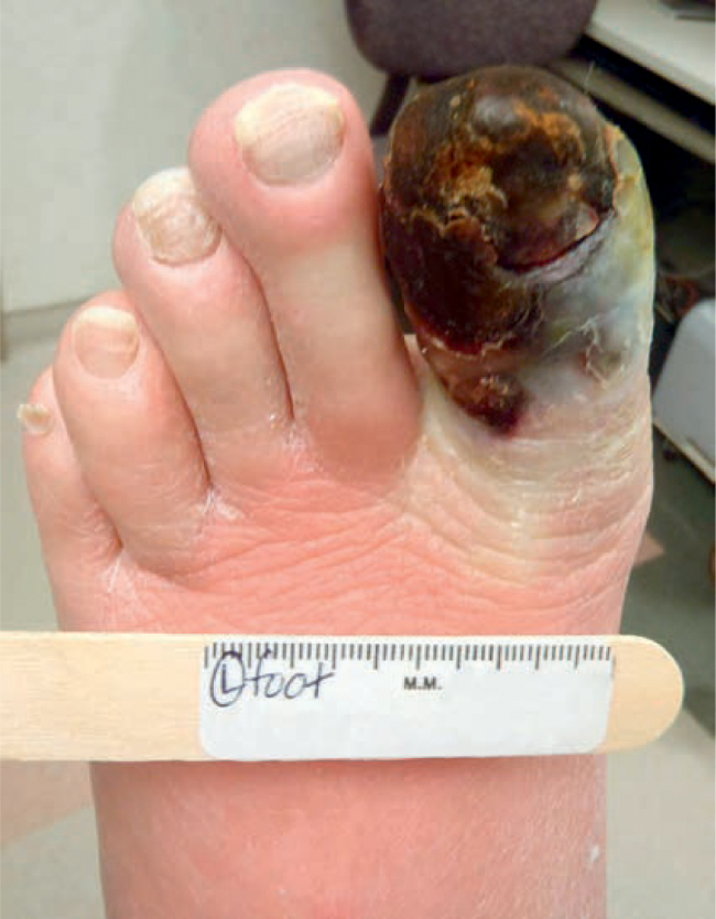 HÌNH 25.1 Hoại tử ngón chân cái trái ở một người đàn ông 76 tuổi mắc bệnh tiểu đường, bệnh động mạch ngoại biên và đã cắt cụt một phần bàn chân phải trước đó.