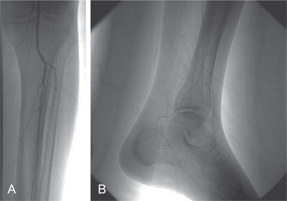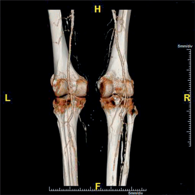 HÌNH 25.6 Chụp cắt lớp vi tính mạch máu của Bệnh nhân trong Hình 25.1 cho thấy bệnh xơ vữa vôi hóa nặng, bao gồm tắc động mạch chày trước và chày sau hai bên. Dòng chảy chính qua các động mạch mác bị bệnh với khả năng tắc động mạch mác phải đoạn gần.
