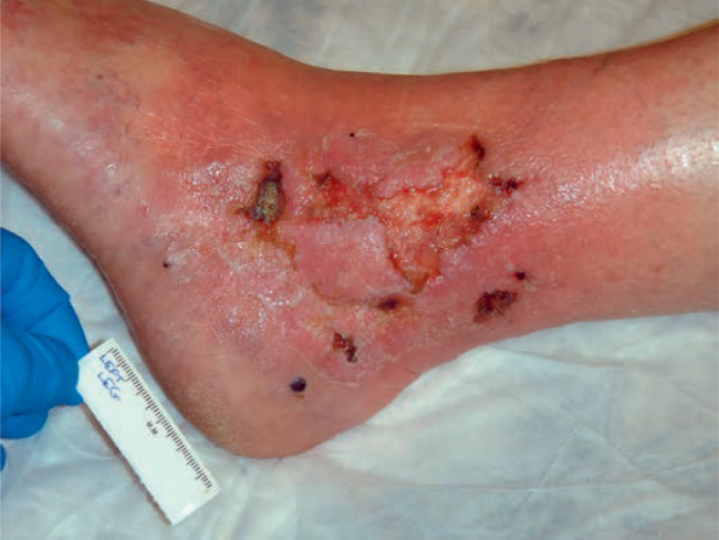 HÌNH 25.9 Ảnh vết thương tái phát quanh mắt cá ở một phụ nữ 67 tuổi bị suy tĩnh mạch mạn tính với giãn tĩnh mạch và viêm da ứ trệ.