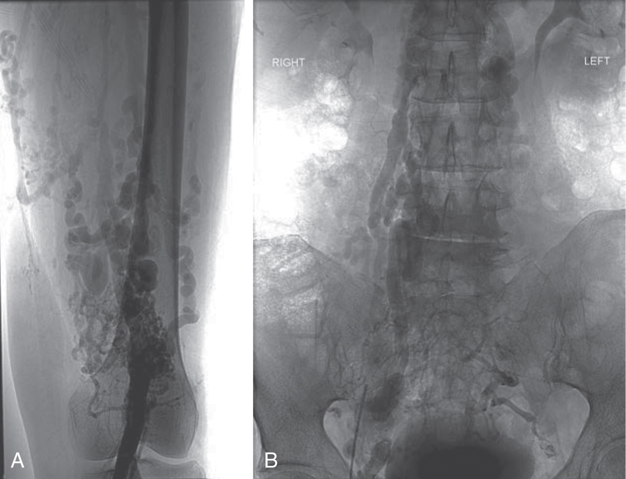 HÌNH 25.11 Chụp tĩnh mạch của Bệnh nhân trong Hình 25.9. (A) Tĩnh mạch đùi bị hẹp nặng ở đoạn trên đùi và dẫn lưu ưu tiên qua một tĩnh mạch xuyên lớn không đủ năng lực đến tĩnh mạch hiển lớn ở đoạn giữa đùi. (B) Các tĩnh mạch chậu ngoài bị tắc hai bên với các mạch bàng hệ vùng chậu rộng rãi dẫn lưu qua đám rối tĩnh mạch cạnh cột sống.