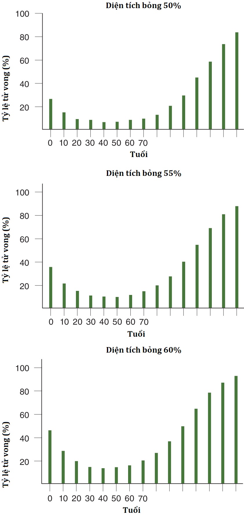 HÌNH 26.1 Ảnh hưởng của tuổi lên Tỷ lệ tử vong phần trăm ở ba kích thước bỏng riêng biệt
