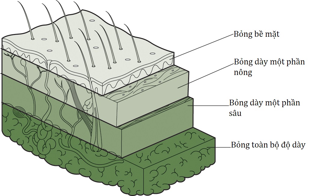 Độ sâu của bỏng nhiệt được chia thành: Nông (chỉ liên quan đến biểu bì, gây đau), Dày một phần (Nông: liên quan đến hạ bì nông; Sâu: liên quan đến các lớp sâu của hạ bì), Toàn bộ độ dày (lan đến các cấu trúc sâu hơn dưới hạ bì, giảm cảm giác thân thể).