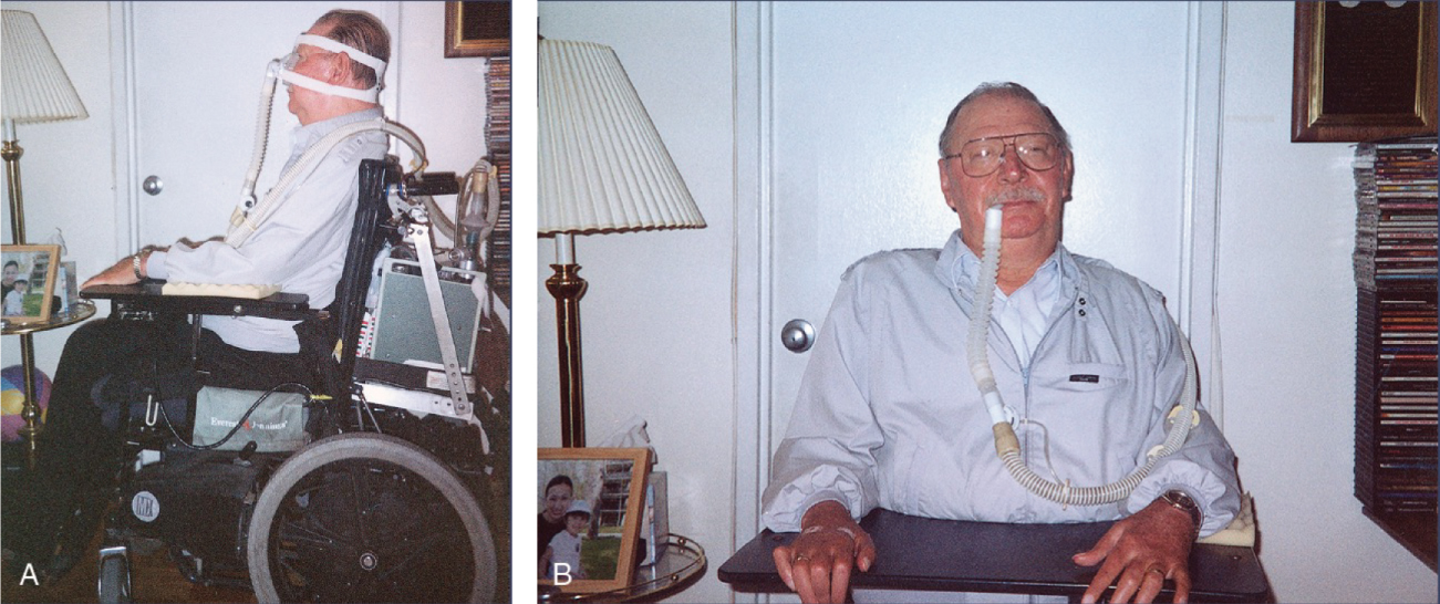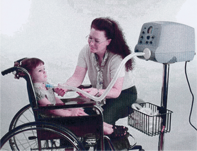 Hình 28.7 Thông khí áp lực dương không xâm lấn ngắt quãng (NIPPV). Gần đây, NIPPV đã thay thế việc sử dụng các máy thở ngoài cơ thể, bao gồm phổi sắt, vỏ ngực, máy thở áp lực bụng ngắt quãng và giường lắc. Máy thở là một máy thở thể tích di động điển hình. Có thể sử dụng nhiều loại giao diện khác nhau.