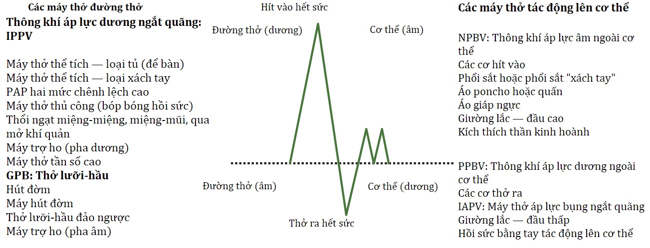 IPPV (Thông khí áp lực dương ngắt quãng) | • Bảng điều khiển máy thở thể tích • Máy thở thể tích di động • PAP hai mức chênh áp cao (BiPAP) • Máy thở thủ công (bóp bóng) • Miệng–miệng, miệng–mũi • Qua ống mở khí quản • Máy hỗ trợ ho (giai đoạn dương) • Máy thở tần số cao |