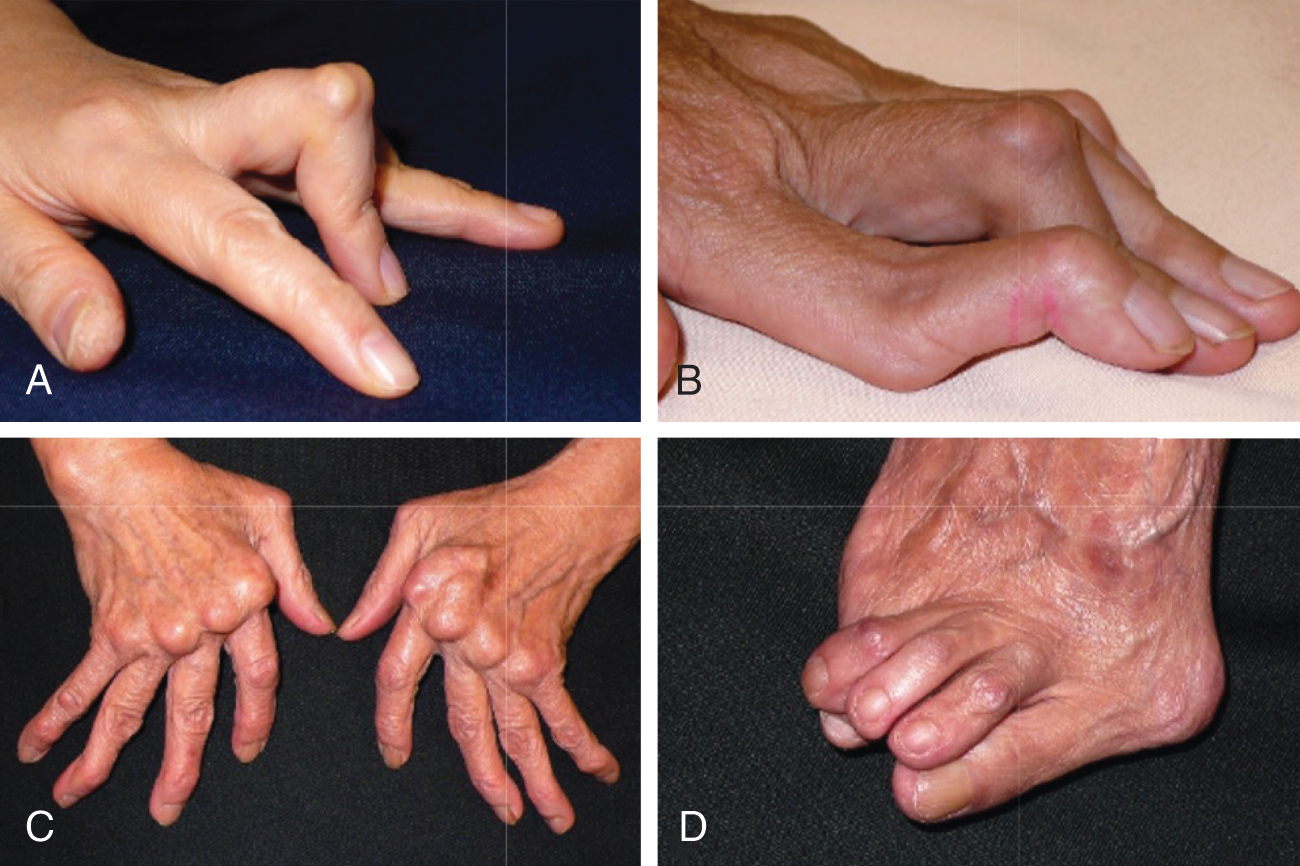 Các biến dạng khác bao gồm lệch trụ của các khớp MCP (xem Hình 31.8C), bán trật cổ tay về phía lòng bàn tay, viêm khớp biến dạng nặng, biến dạng ngón chân hình búa, biến dạng ngón chân hình vuốt, bàn chân bẹt, vẹo ngón chân cái (xem Hình 31.8D), bán trật đầu xương bàn chân, và biến dạng hình Z của ngón cái.