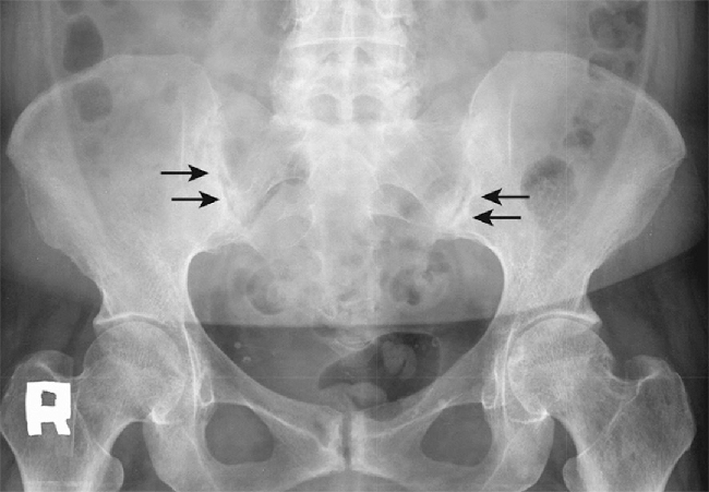Các dấu hiệu X-quang thường của viêm khớp cùng chậu bao gồm hẹp khe khớp, xơ cứng, bào mòn, và dính xương (Hình 31.13). Chúng đã được chia thành năm cấp độ (Bảng 31.14). Phim X-quang chậu cho thấy bào mòn và viêm xương ở ụ ngồi, mấu chuyển xương đùi, mào chậu, và khớp mu. Thay đổi X-quang của cột sống có thể bao gồm hình vuông hóa các thân đốt sống, cầu xương (syndesmophytes) (Hình 31.15), dính các khớp mỏm khớp, và vôi hóa dây chằng dọc trước.