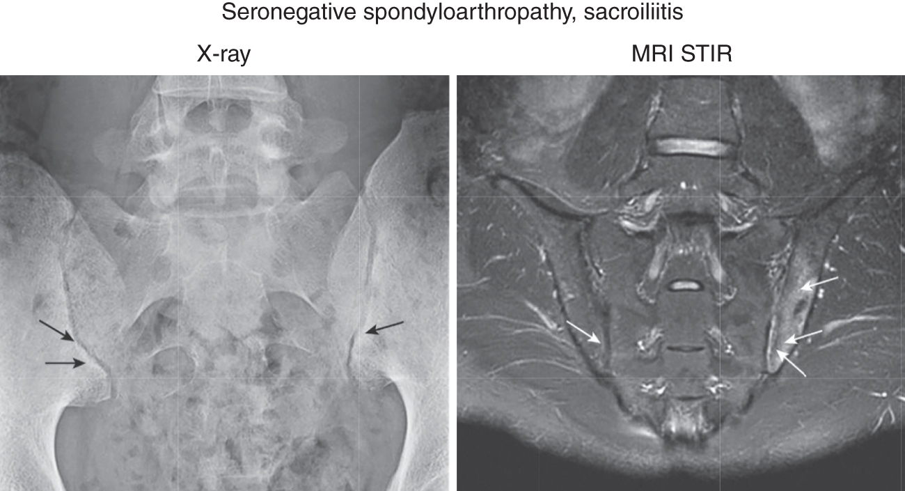 Nếu phim X-quang chậu thường không đáp ứng các tiêu chí cho viêm khớp cùng chậu nhưng nghi ngờ về AS vẫn cao, bước tiếp theo là MRI (hình ảnh T2-weighted triệt tiêu mỡ hoặc STIR), có thể cho thấy phù tủy xương ở các xương liền kề với các khớp bị ảnh hưởng (Hình 31.16).