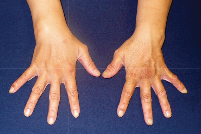 Biến dạng cài khuy (Hình 31.8A) là tình trạng gập khớp PIP và duỗi khớp DIP. Trong tình trạng này, gân duỗi bị phá hủy bởi viêm bao gân, khớp PIP bật lên về phía mu tay, dẫn đến sự dịch chuyển sang bên và về phía lòng bàn tay của các dải bên của gân duỗi.