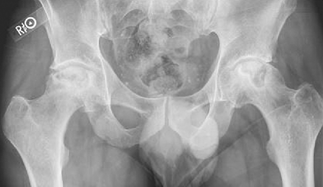X-quang khung chậu thẳng, cho thấy hoại tử vô mạch tiến triển của cả hai chỏm xương đùi.