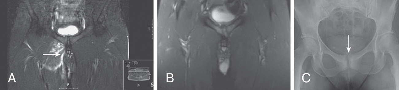 (A) Hình ảnh cộng hưởng từ (MRI) đứng dọc T2W, phục hồi đảo ngược của một vận động viên đá bóng đại học, cho thấy một vết rách xuất huyết (mũi tên) của các cơ khép háng phải của ngành mu. (B) MRI đứng ngang T2W, triệt tiêu mỡ của khung chậu của một vận động viên nhảy sào đại học, cho thấy tín hiệu tăng của cả hai ngành mu và khớp mu, phù hợp với các phản ứng mỏi của các ngành mu trên và viêm khớp mu. (C) X-quang thẳng của khung chậu, cho thấy sự bất thường, hình thành nang dưới sụn và xơ cứng dưới sụn của khớp mu (mũi tên), phù hợp với viêm khớp mu. Bệnh nhân là một cầu thủ bóng đá 22 tuổi bị đau bẹn hai bên mạn tính.