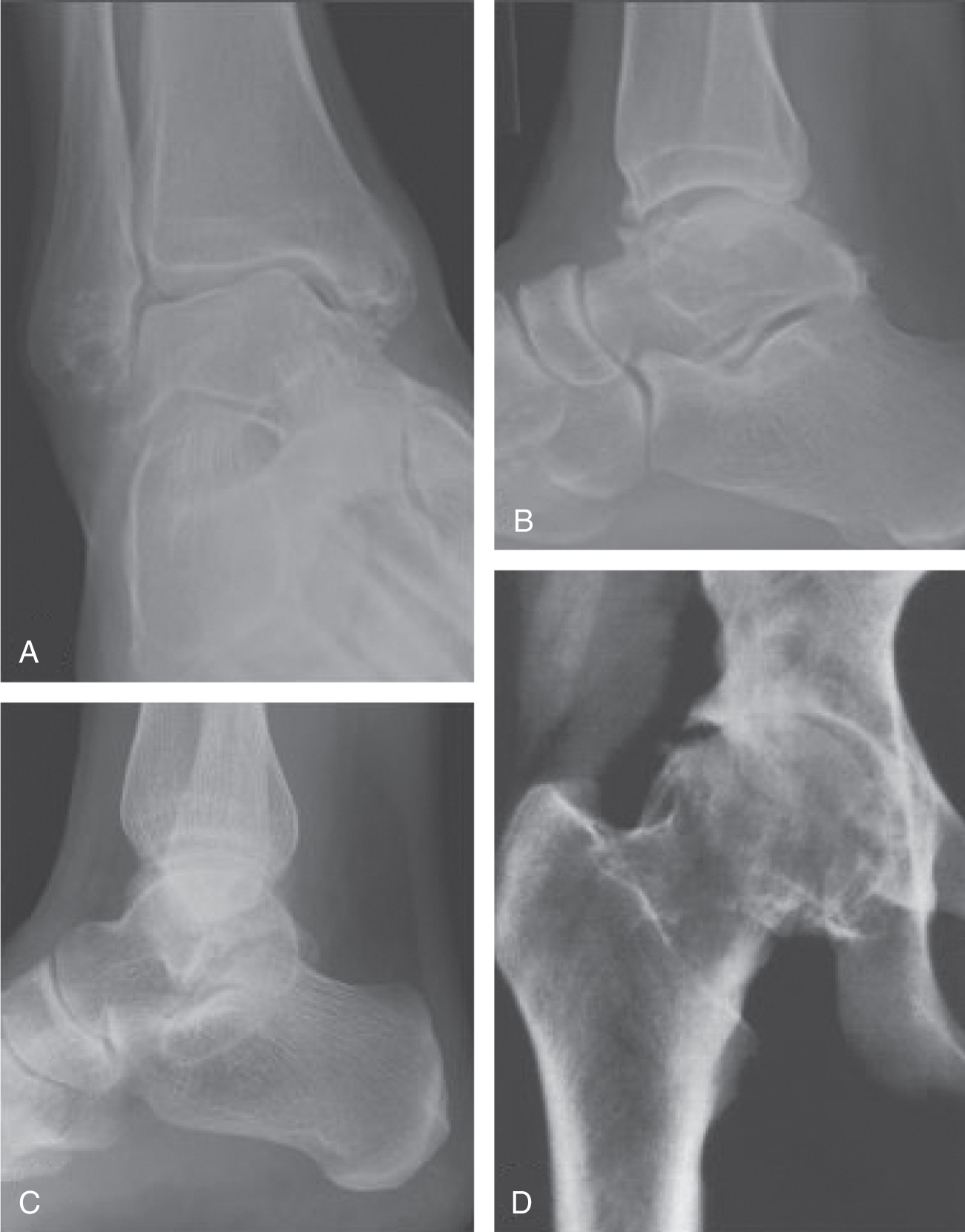 X-quang thẳng (A) và bên (B) của mắt cá chân, cho thấy thoái hóa khớp (OA) tiến triển ở khớp mắt cá chân. Có các gai xương lớn ở mặt lưng, các thể vôi hóa nhỏ trong khớp, và có sự thẳng hàng vẹo trong ở khớp, với sự mở rộng của khe khớp bên ngoài, phù hợp với lỏng lẻo dây chằng mạn tính. (C) X-quang nghiêng của góc, cho thấy OA tiến triển của khớp dưới sên sau. Có sự bất thường đáng kể của các rìa khớp, với xơ cứng dưới sụn và hình thành nang. (D) X-quang thẳng của háng, cho thấy thoái hoá khớp rất nặng, với sự xóa gần như hoàn toàn của khe khớp và sự tái tạo rộng rãi của chỏm xương đùi.