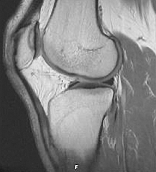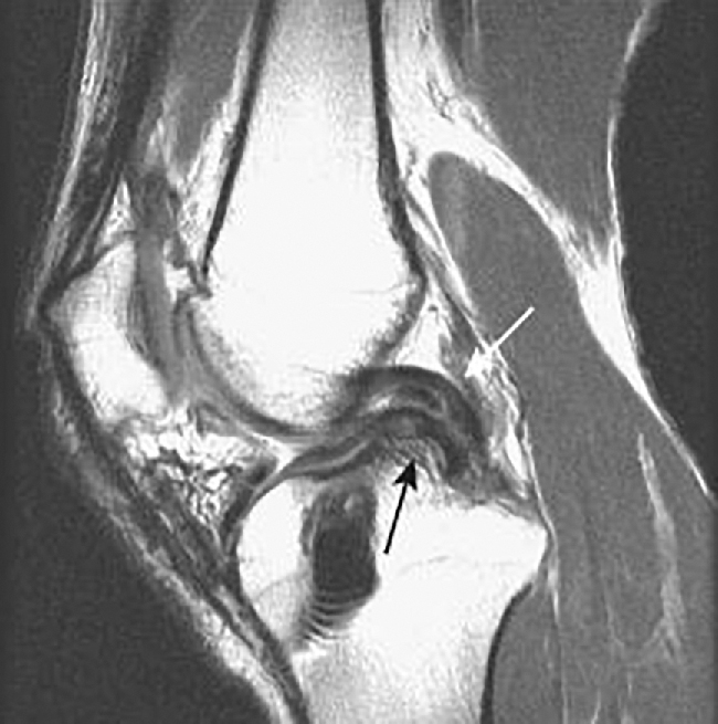 MRI đứng dọc T1 của một đầu gối, cho thấy một vết rách sụn chêm dạng quai xô đã lật lên vào khuyết liên lồi tạo ra cái gọi là dấu hiệu dây chằng chéo sau (PCL) đôi. Bệnh nhân là một vận động viên trượt tuyết núi cao Olympic đã được tái tạo ACL trước đó và bị chấn thương sụn chêm này trong khi thi đấu. Đường hầm và vít chày không được đặt đủ ra trước trong xương chày, về cơ bản tạo ra một mảnh ghép ACL không chức năng và để lại đầu gối không ổn định. Đường đen trên, được biểu thị bằng mũi tên trắng, là PCL thực sự. Đường đen dưới (mũi tên đen) là vết rách sụn chêm dạng quai xô đã di lệch vào khuyết liên lồi.