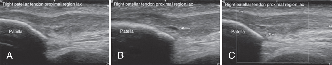 Hình ảnh cộng hưởng từ T1W đứng dọc của đầu gối, cho thấy sự thay đổi tín hiệu rộng rãi trong gân bánh chè xa. Hình ảnh siêu âm thang xám 5 đến 12 MHz dọc của gân bánh chè gần cho thấy (A) một vết rách trong chất, dọc, giảm âm, dày, không rõ ràng với (B) hình ảnh Doppler màu cho thấy các vùng tăng tưới máu trong gân.