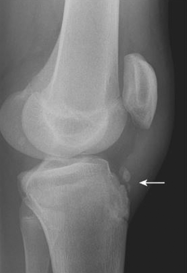 X-quang nghiêng của đầu gối cho thấy hình ảnh điển hình của bệnh Osgood-Schlatter. Có sự bất thường và phân mảnh của lồi củ chày (mũi tên). Bệnh nhân là một đô vật 16 tuổi có tiền sử đau gối trước ngày càng tăng trong 3 tháng. Đầu gối còn lại của anh và đầu gối của anh trai anh đều có hình ảnh X-quang tương tự.