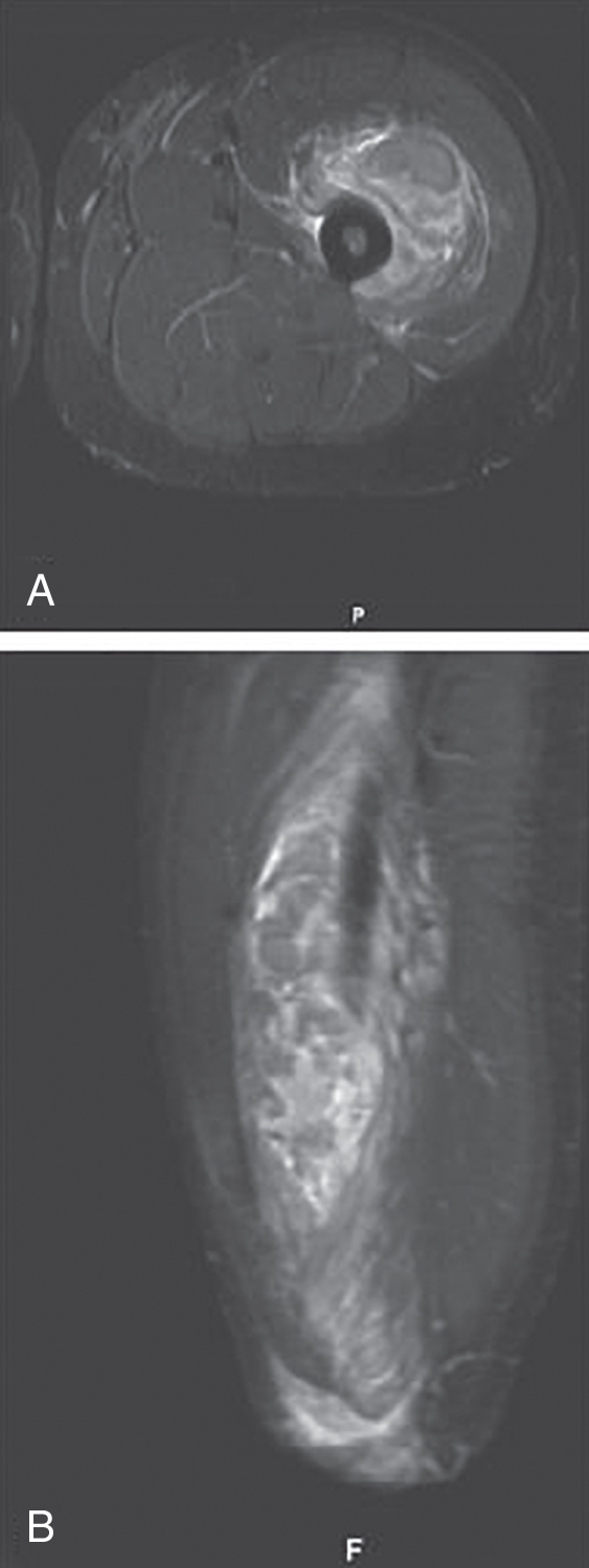 Hình ảnh cộng hưởng từ T2W mặt phẳng ngang (A) và đứng dọc (B) của đùi cho thấy một vết đụng dập lớn của cơ rộng giữa. Bệnh nhân là một vận động viên khúc côn cầu Olympic nữ bị đầu gối của một cầu thủ nam va vào trong một trận đấu tập. Các lực được truyền hiệu quả qua các cơ tứ đầu nông, không bị tổn thương, đến cơ tứ đầu sâu. Với sự phục hồi chức năng tích cực, vận động viên đã có thể thi đấu trong Thế vận hội và dẫn đầu đội của mình về số điểm. Cô không phát triển viêm cơ cốt hóa.