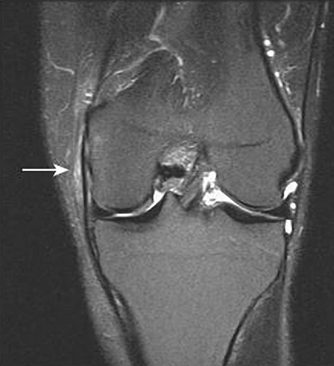 Hình ảnh cộng hưởng từ đứng dọc T2W, triệt tiêu mỡ của đầu gối cho thấy tín hiệu tăng xung quanh dây chằng bên trong với các sợi của dây chằng còn nguyên vẹn, phù hợp với căng độ 1 (mũi tên). Bệnh nhân là một cầu thủ bóng bầu dục bị chấn thương vẹo ngoài đầu gối khi chân đặt trên mặt đất.