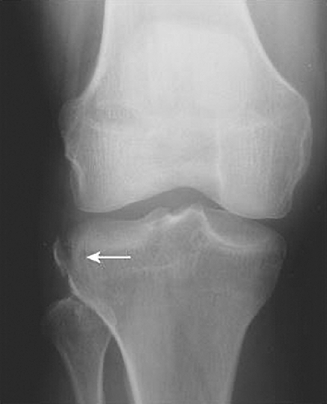 X-quang thẳng của đầu gối, cho thấy một gãy Segond lớn (mũi tên), cho thấy khả năng có rách dây chằng chéo trước.
